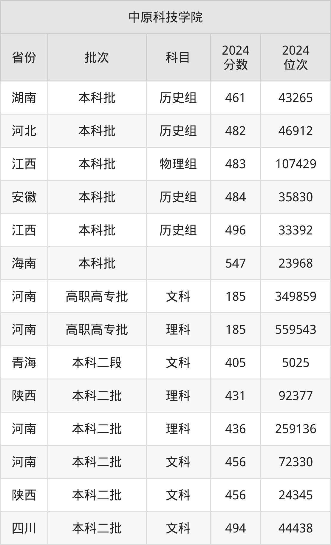 在湖南本科批历史组,中原科技学院的最低分是461、最低录取位次是43265名。在河北本科批历史组,中原科技学院的最低分是482、最低录取位次是46912名。