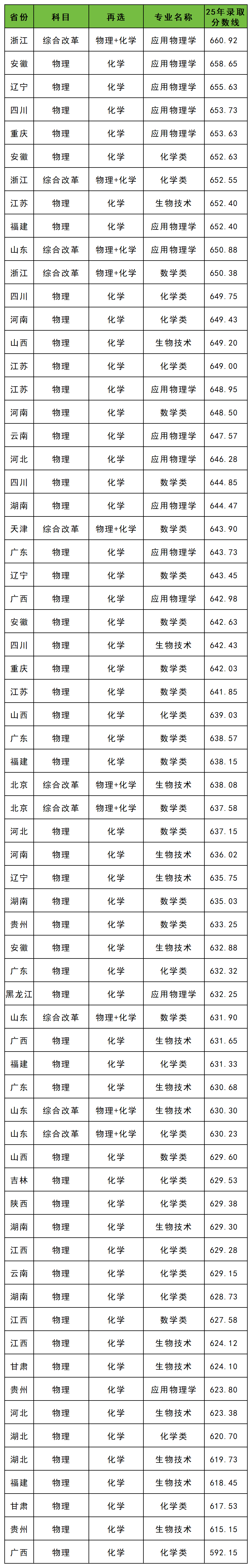 数据显示,华南理工大学强基录取分数线基本在610分以上,其中分数上660分的省份有浙江(应用物理学660.92分)。