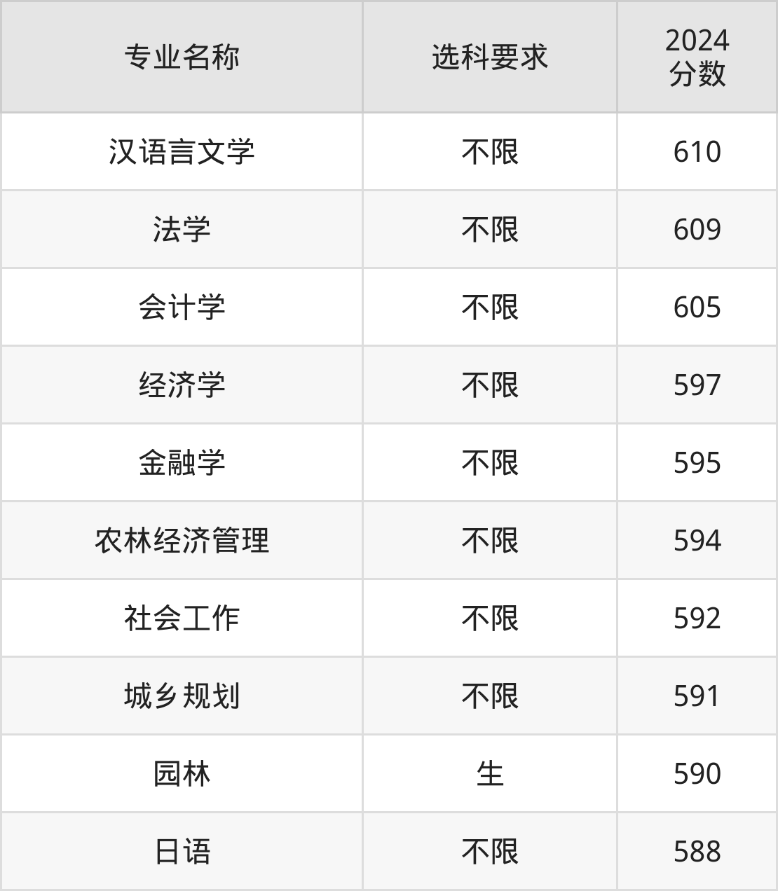 对于浙江高三学生而言,安徽农业大学热门专业是:汉语言文学、法学、会计学、经济学、金融学、农林经济管理、社会工作、城乡规划、园林、日语,2024年在浙江的最低分是588至610。