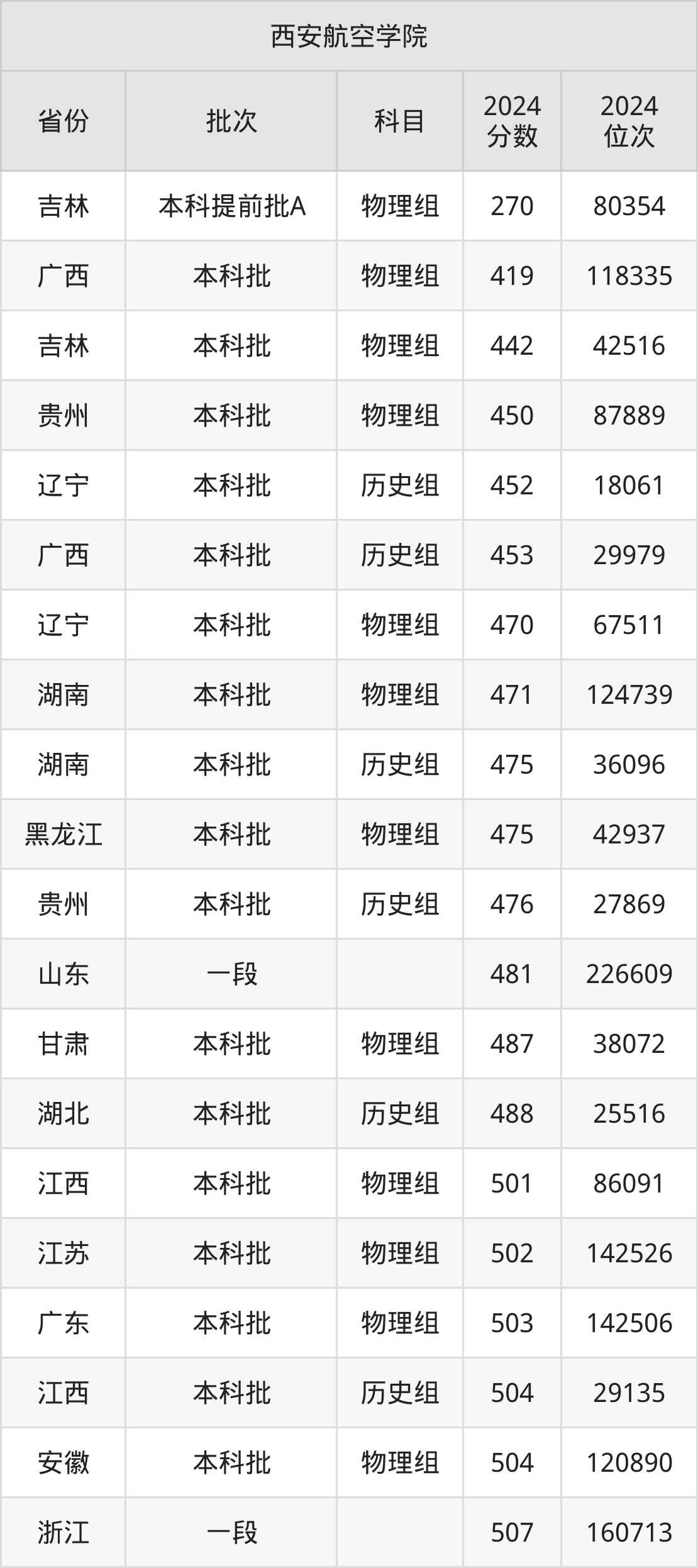 在吉林本科提前批A物理组,西安航空学院的最低分是270、最低录取位次是80354名。在广西本科批物理组,西安航空学院的最低分是419、最低录取位次是118335名。