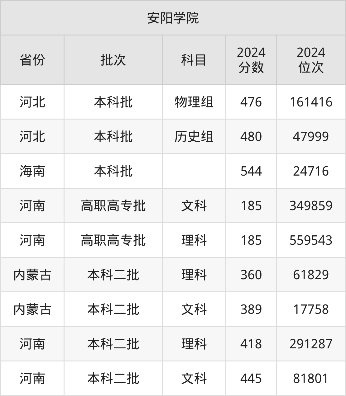 在河北本科批物理组,安阳学院的最低分是476、最低录取位次是161416名。在海南本科批,安阳学院的最低分是544、最低录取位次是24716名。