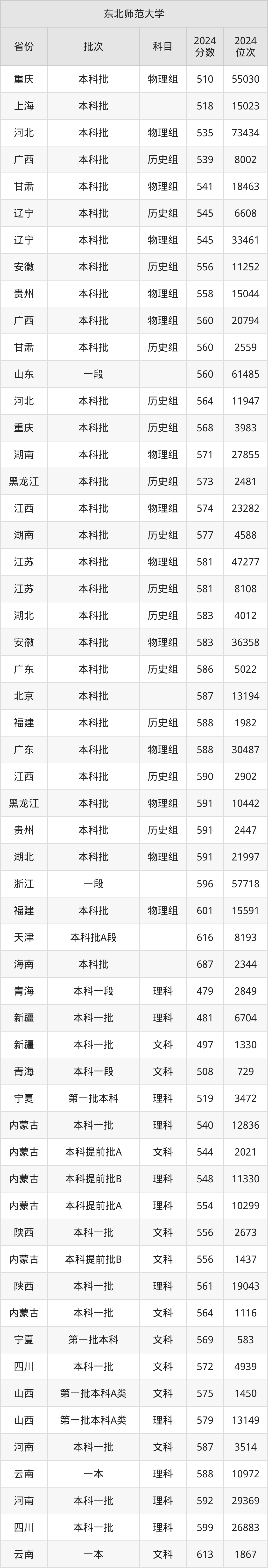 在重庆本科批物理组,东北师范大学的最低分是510、最低录取位次是55030名。在上海本科批,东北师范大学的最低分是518、最低录取位次是15023名。