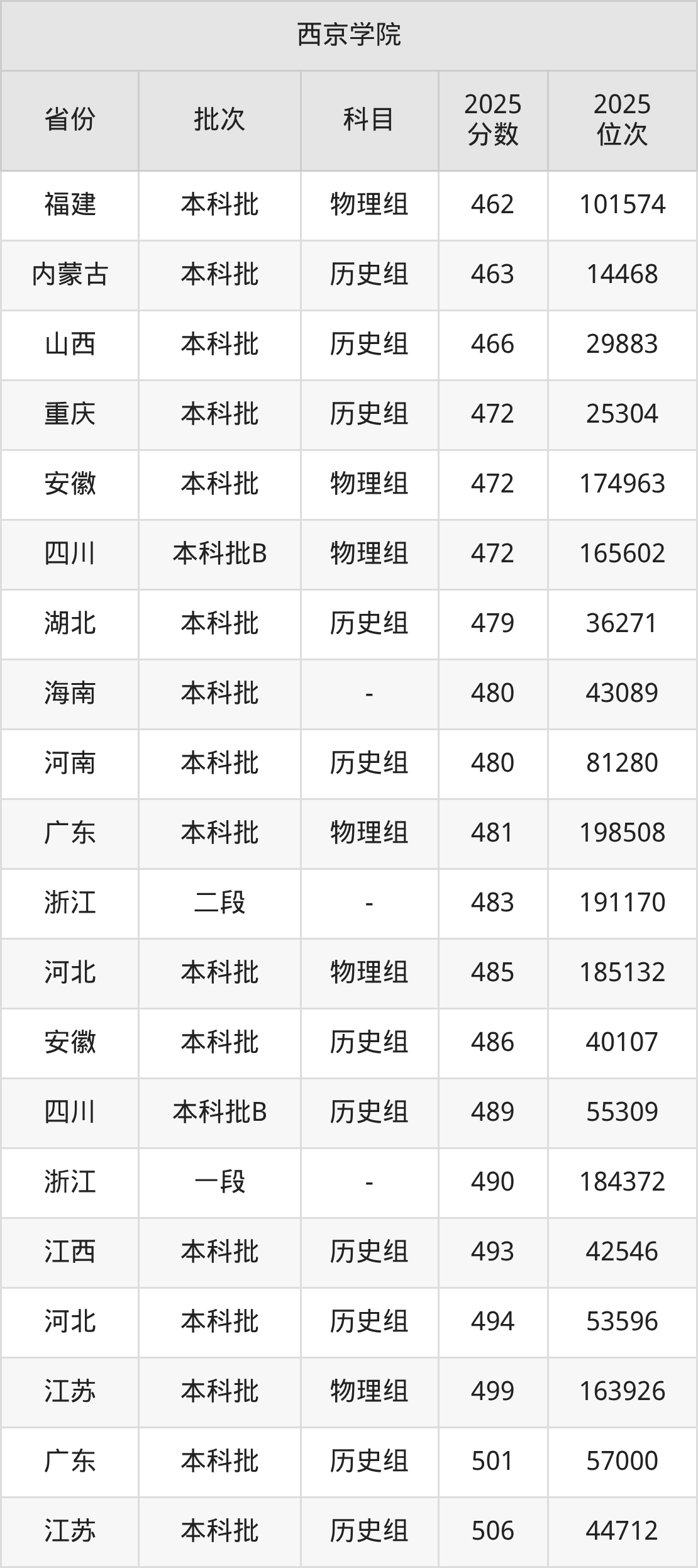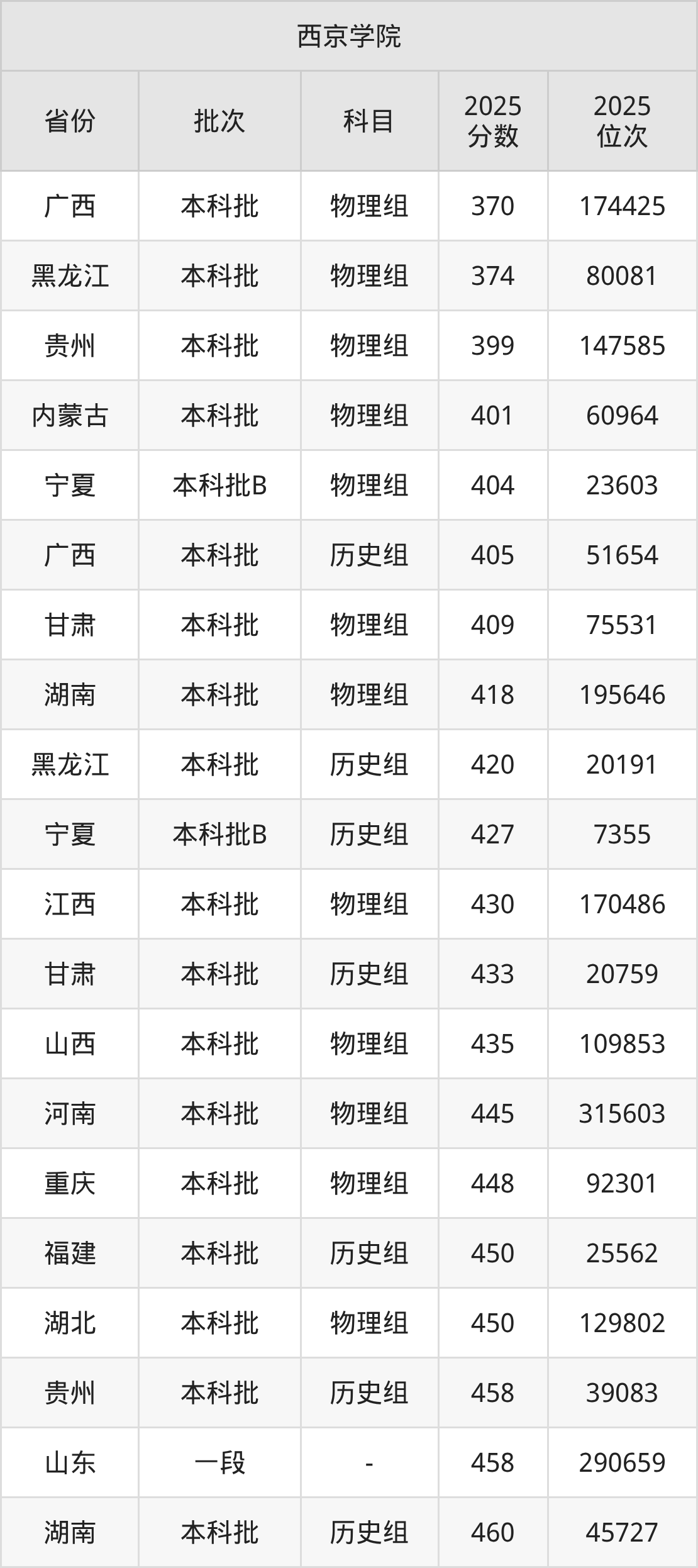 圆梦小编为2026届想要报考西京学院的同学整理了:西京学院2025年在全国22个省的最低分及录取位次。