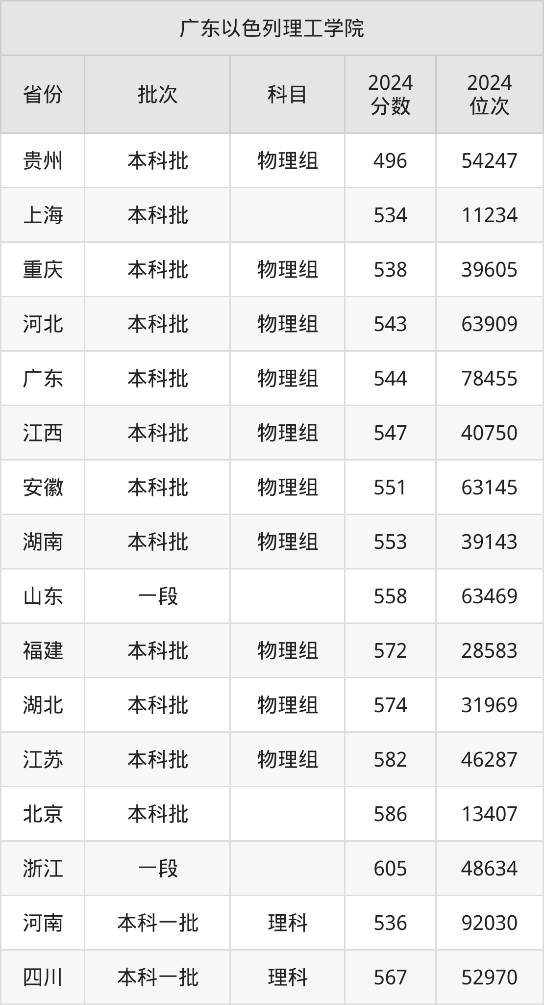 在贵州本科批物理组,广东以色列理工学院的最低分是496、最低录取位次是54247名。在上海本科批,广东以色列理工学院的最低分是534、最低录取位次是11234名。