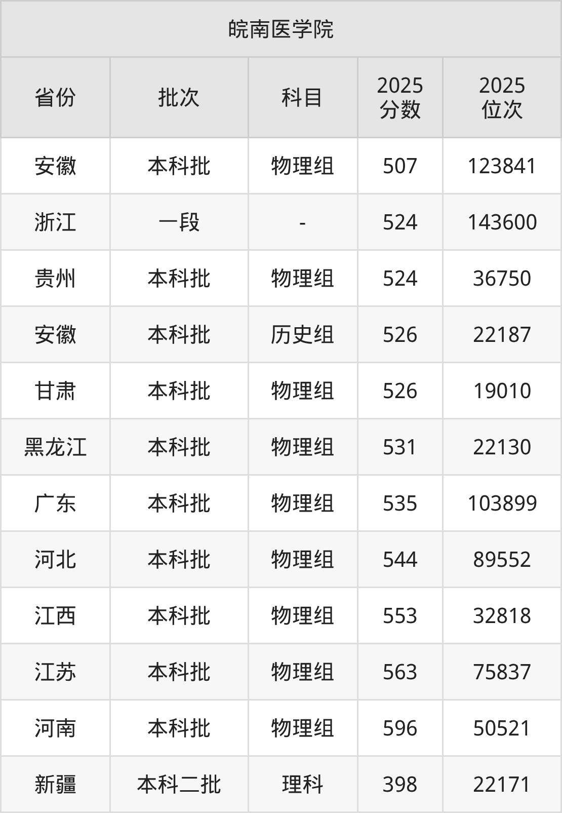在安徽本科批物理组,皖南医学院的最低分是507、最低录取位次是123841名。在浙江一段,皖南医学院的最低分是524、最低录取位次是143600名。
