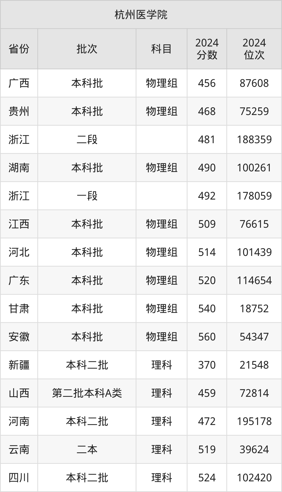 在广西本科批物理组,杭州医学院的最低分是456、最低录取位次是87608名。在贵州本科批物理组,杭州医学院的最低分是468、最低录取位次是75259名。