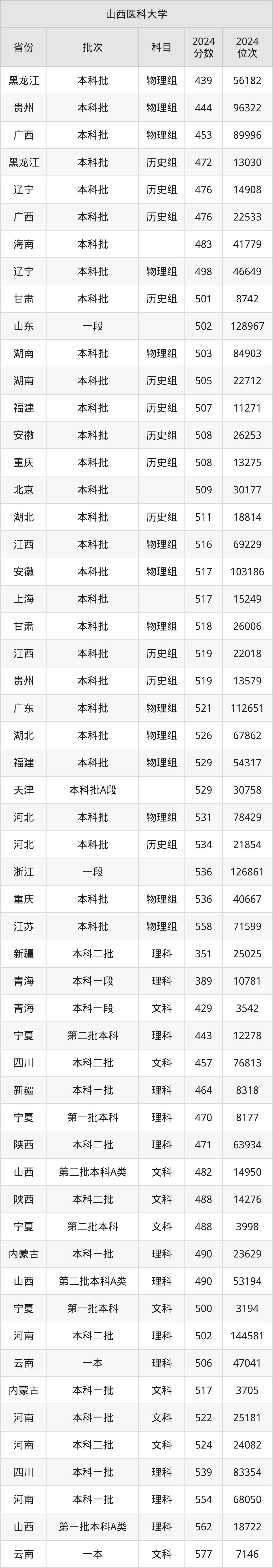 圆梦小编为2025届想要报考山西医科大学的同学整理了:山西医科大学2024年在全国29个省的最低分及录取位次。