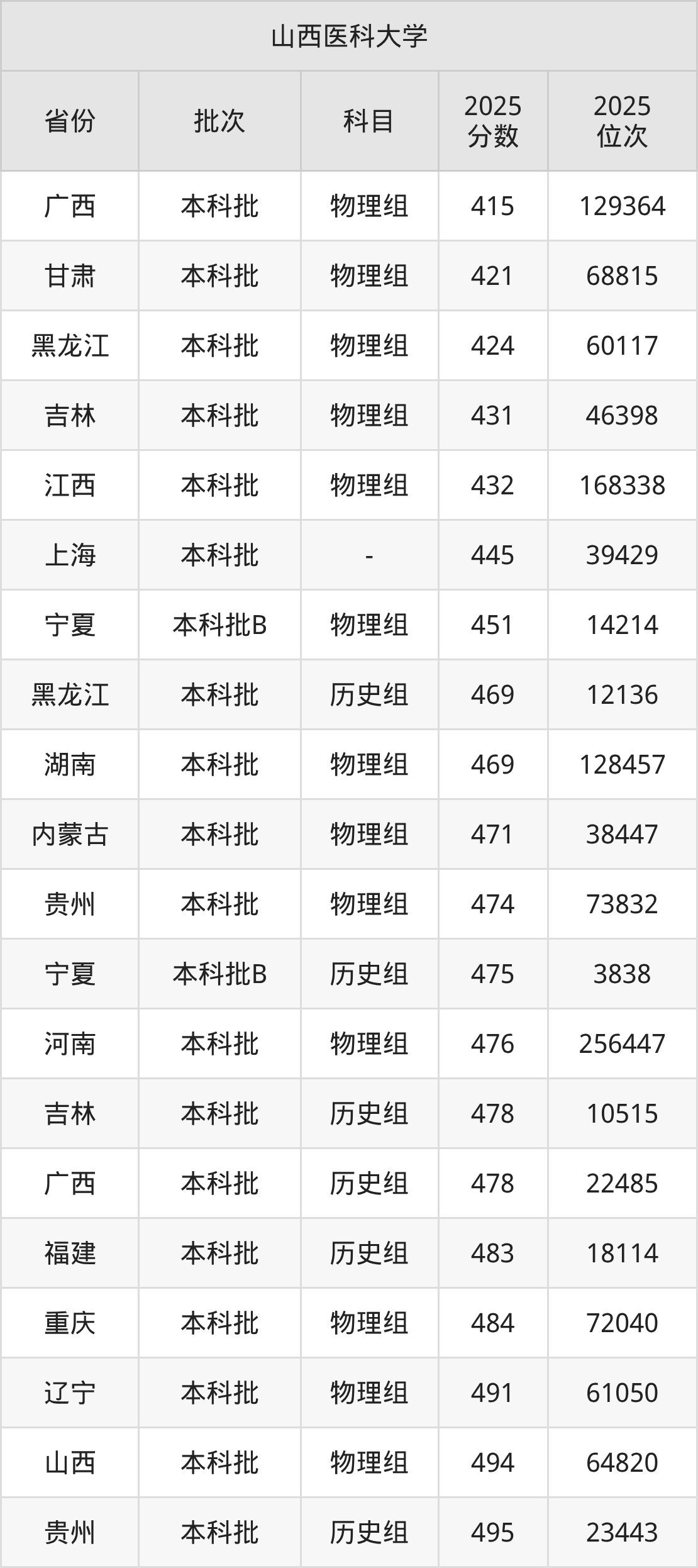 二、山西医科大学2025年录取分数线汇总