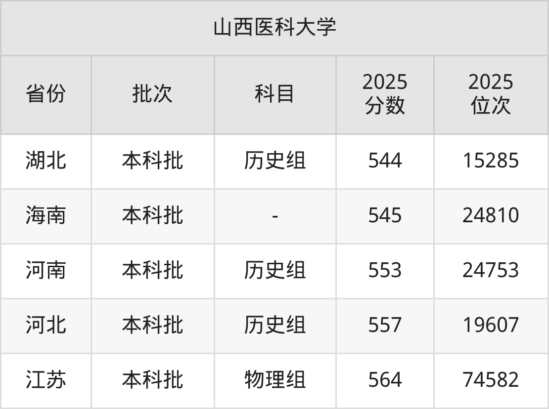 圆梦小编为2026届想要报考山西医科大学的同学整理了:山西医科大学2025年在全国26个省的最低分及录取位次。