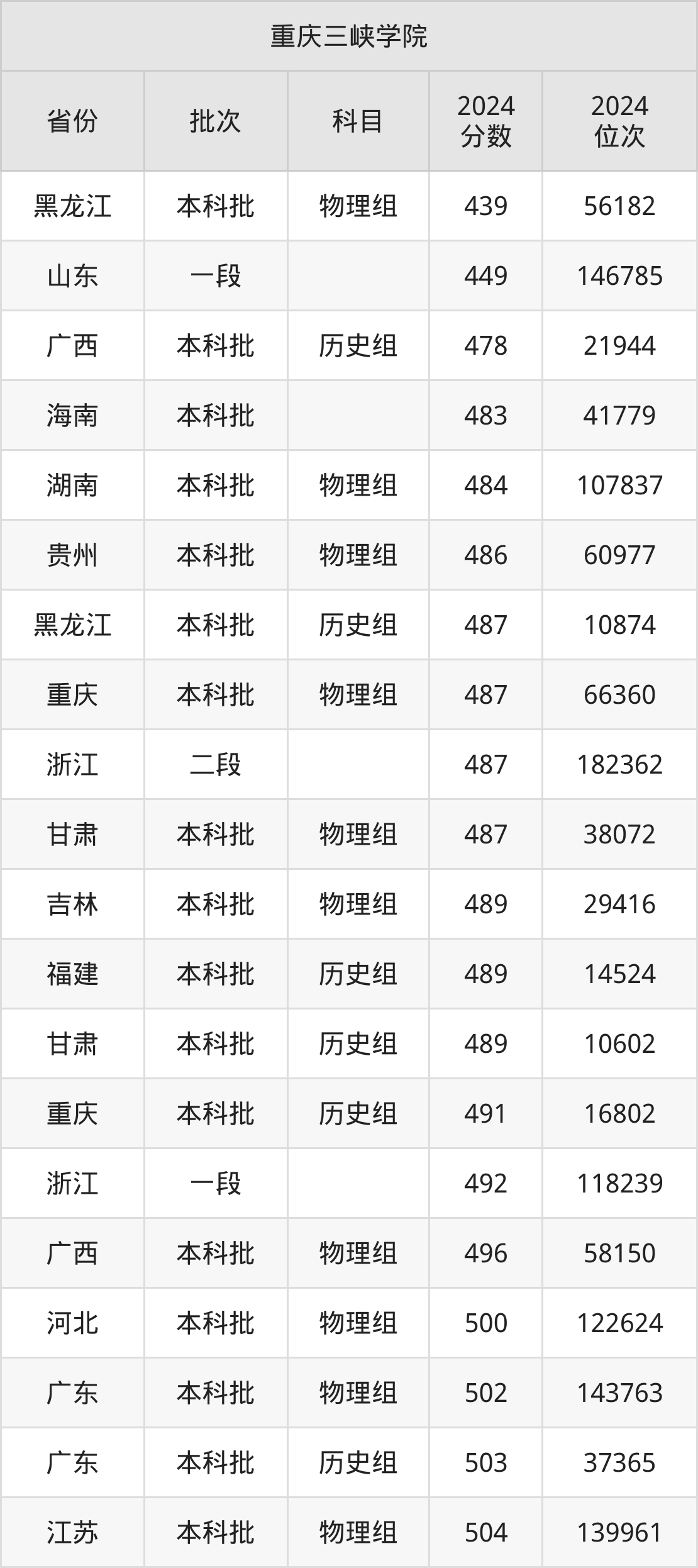 在黑龙江本科批物理组,重庆三峡学院的最低分是439、最低录取位次是56182名。在山东一段,重庆三峡学院的最低分是449、最低录取位次是146785名。