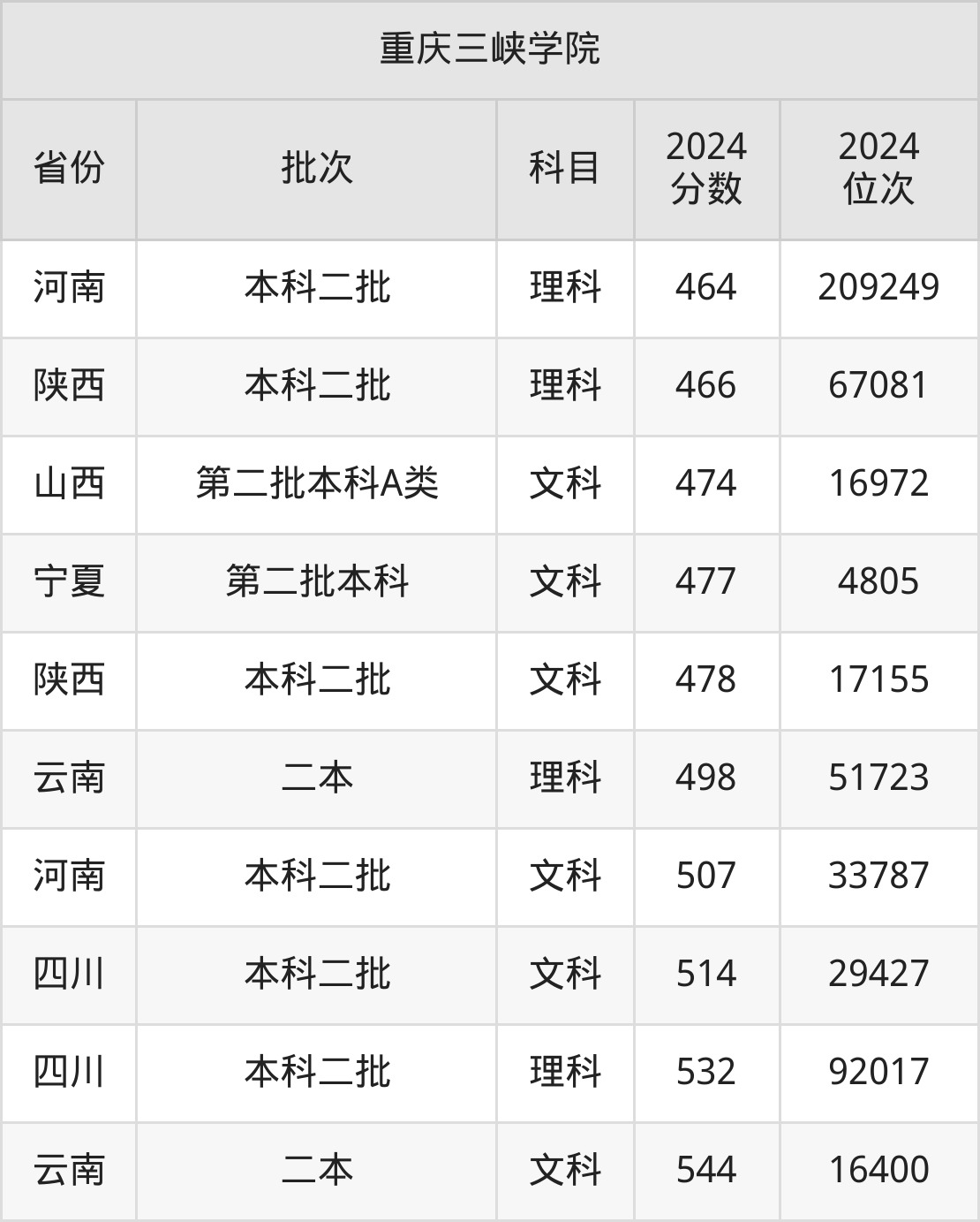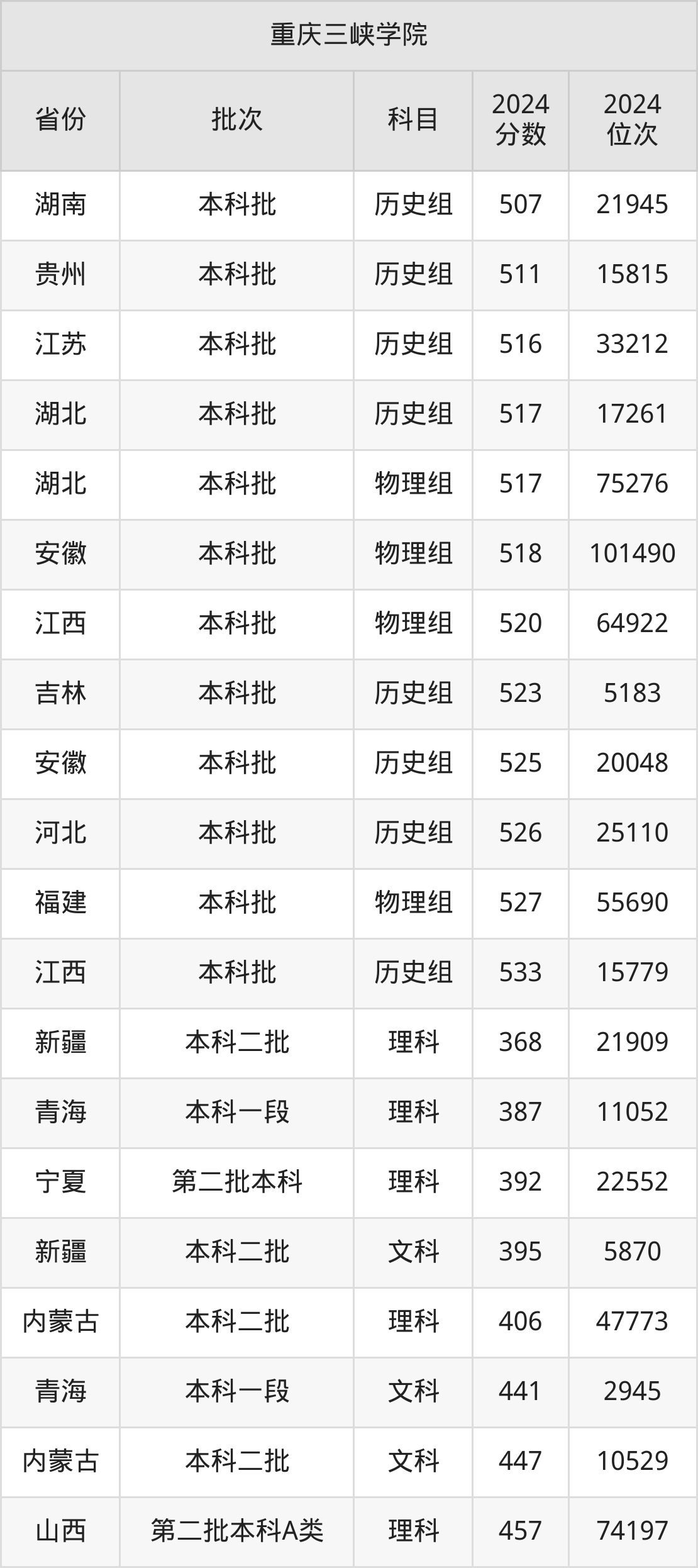 圆梦小编为2025届想要报考重庆三峡学院的同学整理了:重庆三峡学院2024年在全国26个省的最低分及录取位次。
