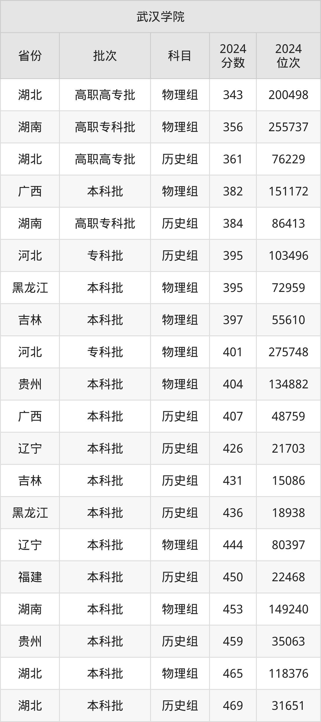 在湖北高职高专批物理组,武汉学院的最低分是343、最低录取位次是200498名。在湖南高职专科批物理组,武汉学院的最低分是356、最低录取位次是255737名。