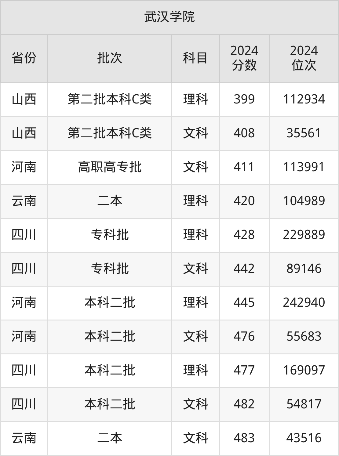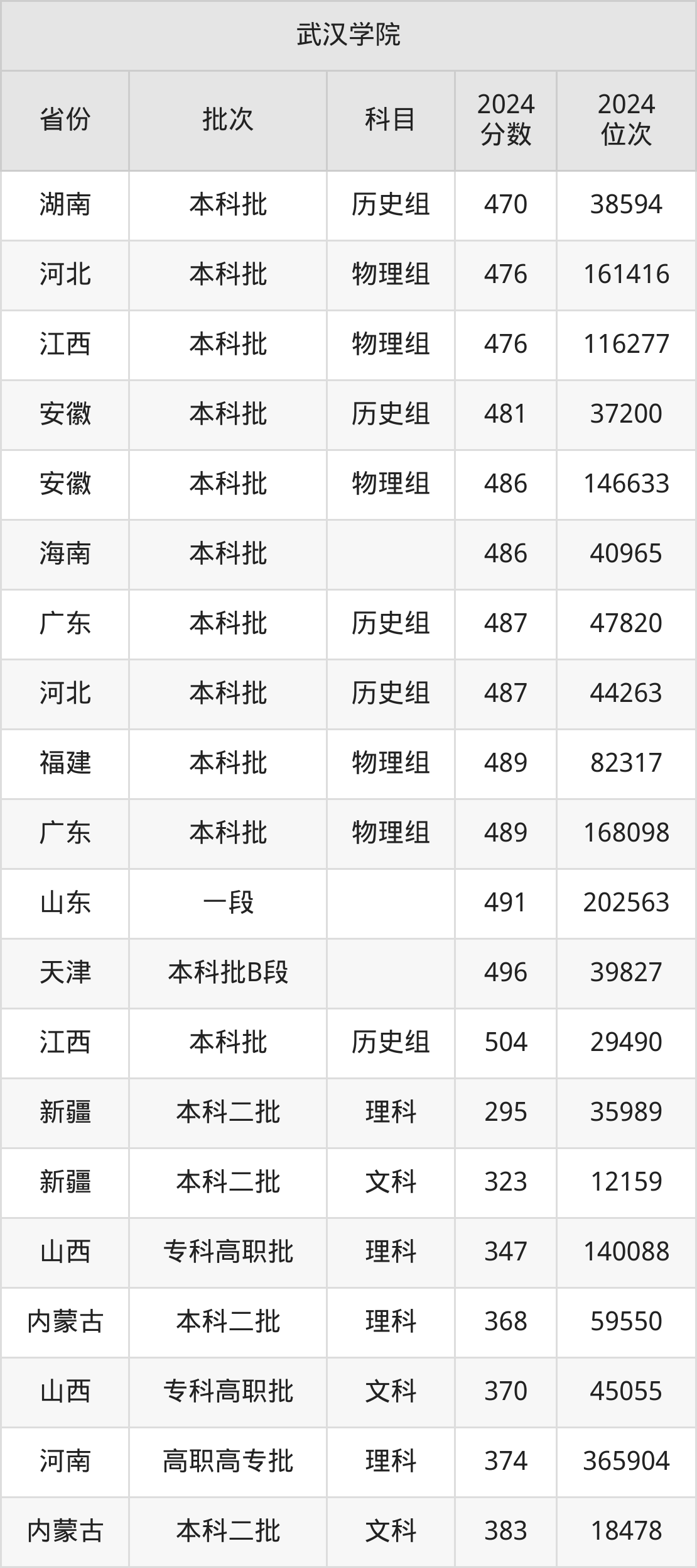 圆梦小编为2025届想要报考武汉学院的同学整理了:武汉学院2024年在全国21个省的最低分及录取位次。