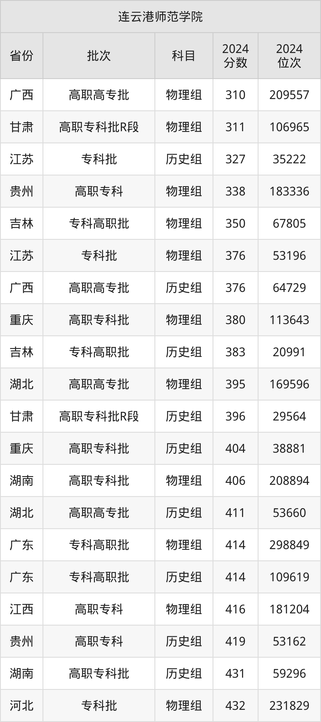 在广西高职高专批物理组,连云港师范学院的最低分是310、最低录取位次是209557名。在甘肃高职专科批R段物理组,连云港师范学院的最低分是311、最低录取位次是106965名。