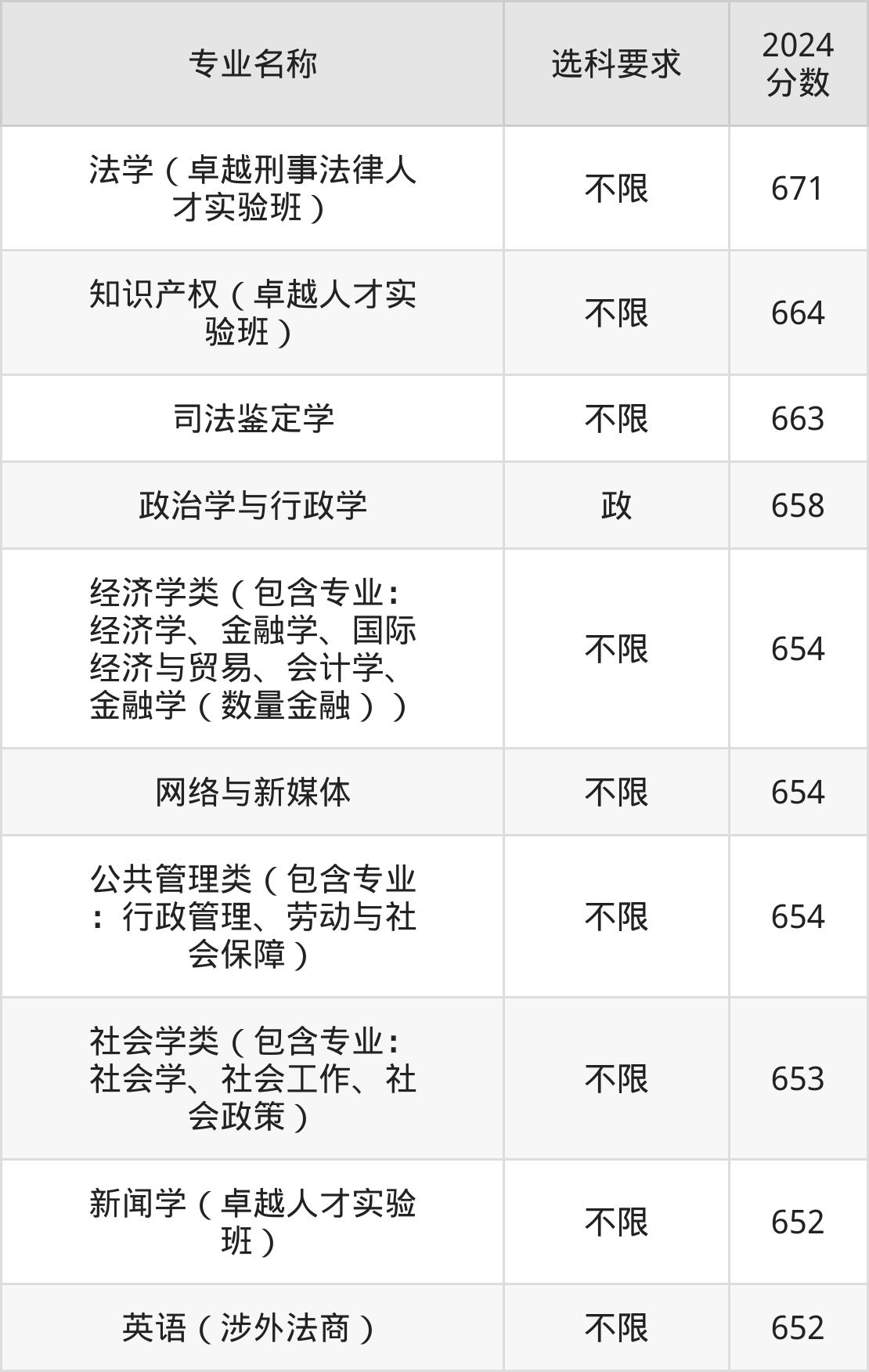 | 知识产权(卓越人才实 验班) | 不限 | 632 |