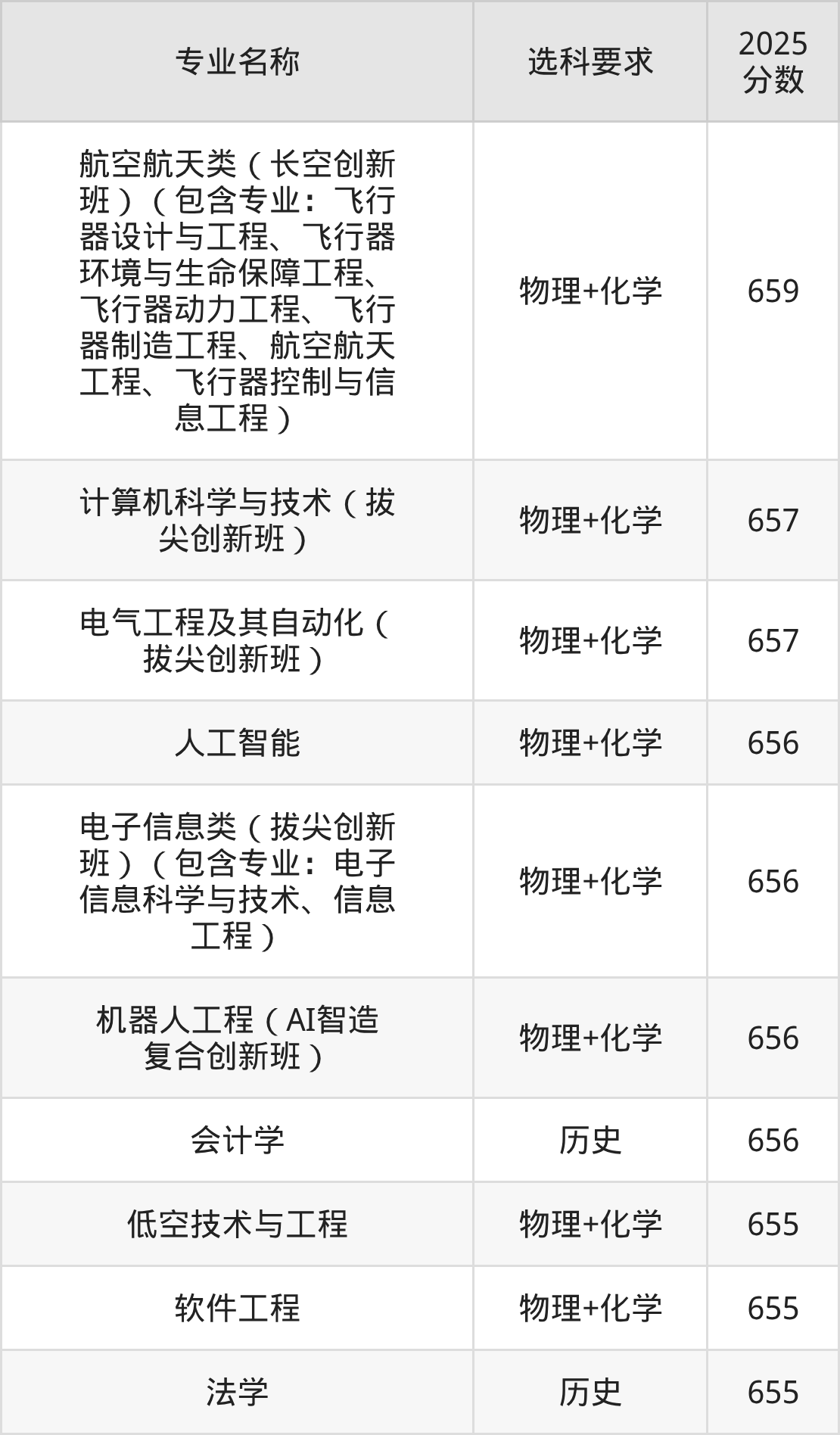 | 航空航天类(长空创新 班)(包含专业:飞行 器设计与工程、飞行器 环境与生命保障工程、 飞行器动力工程、飞行 器制造工程、航空航天 工程、飞行器控制与信 息工程) | 物理+化学 | 646 |