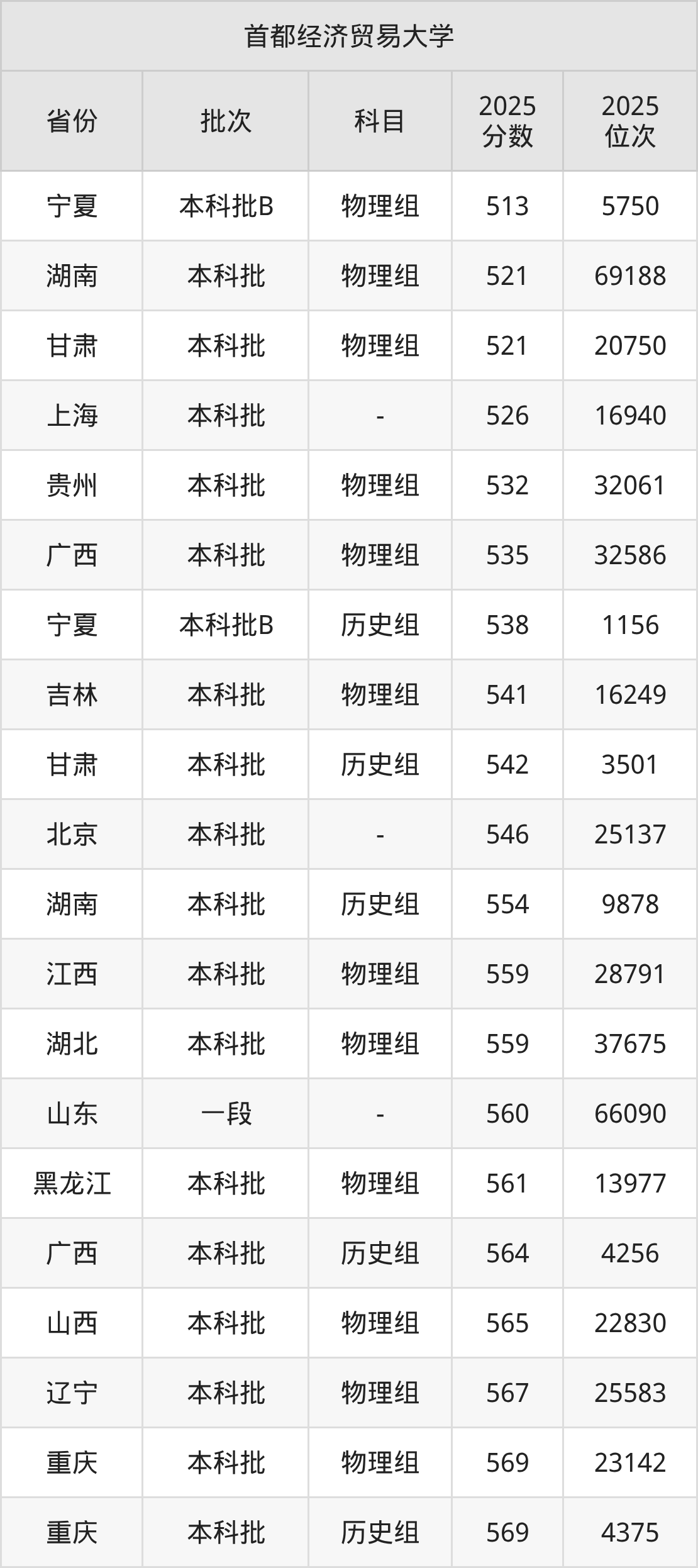 在宁夏本科批B物理组,首都经济贸易大学的最低分是513、最低录取位次是5750名。在湖南本科批物理组,首都经济贸易大学的最低分是521、最低录取位次是69188名。