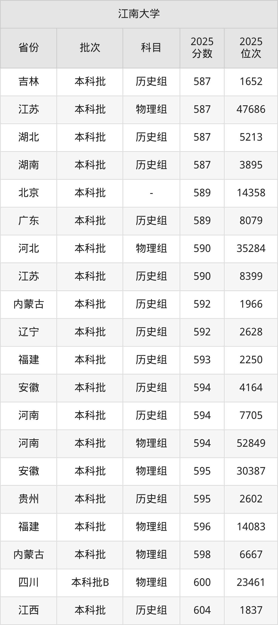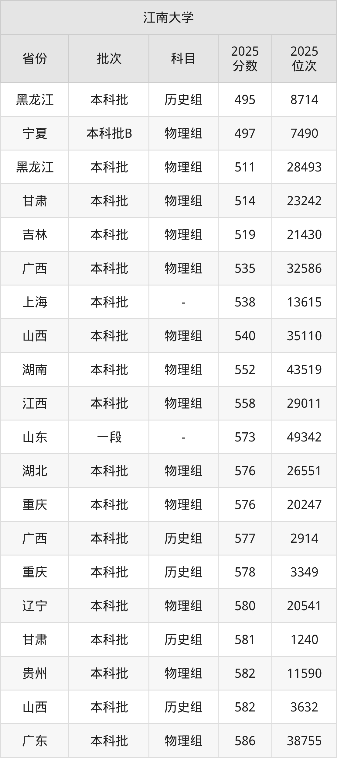 二、江南大学2025年录取分数线汇总