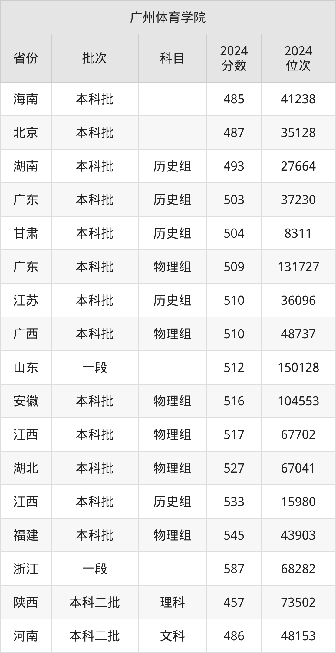 圆梦小编为2025届想要报考广州体育学院的同学整理了:广州体育学院2024年在全国15个省的最低分及录取位次。