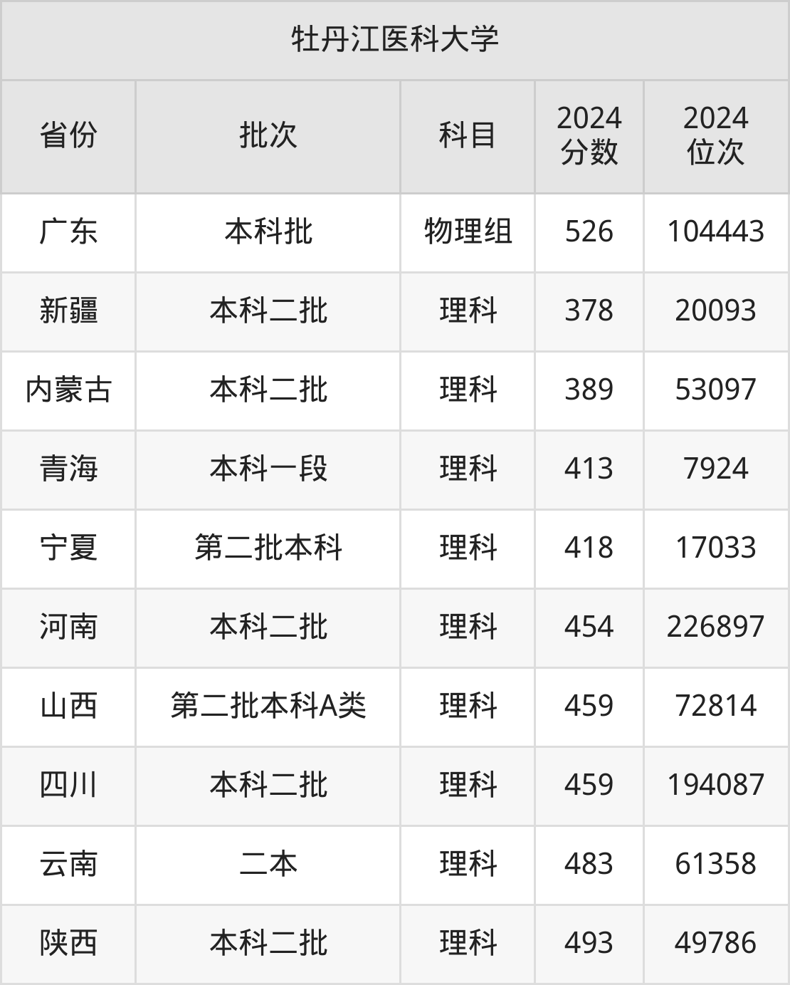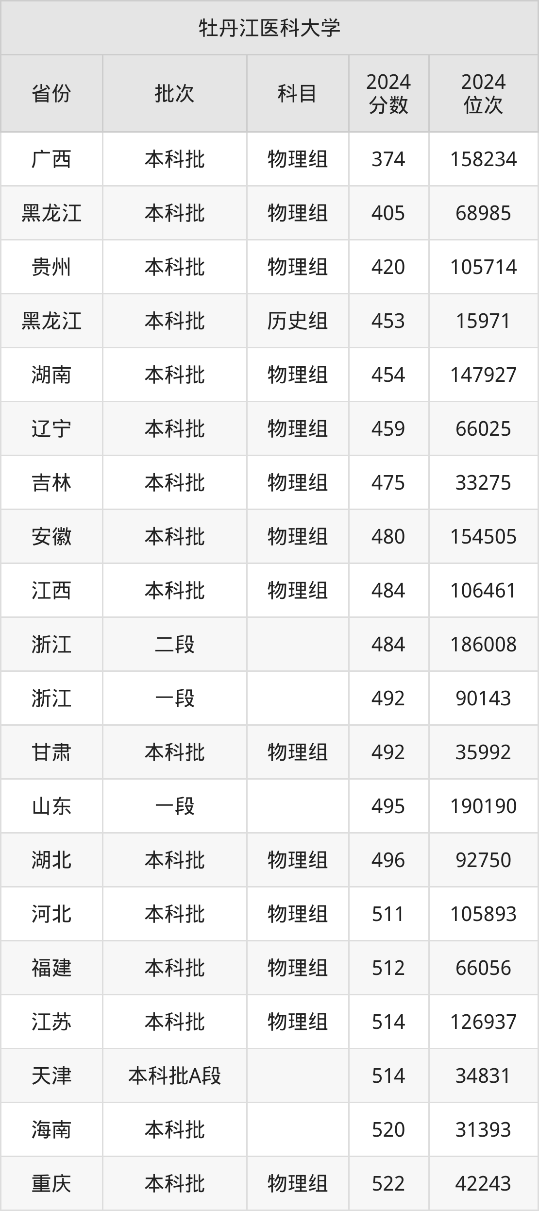 在广西本科批物理组,牡丹江医科大学的最低分是374、最低录取位次是158234名。在黑龙江本科批物理组,牡丹江医科大学的最低分是405、最低录取位次是68985名。