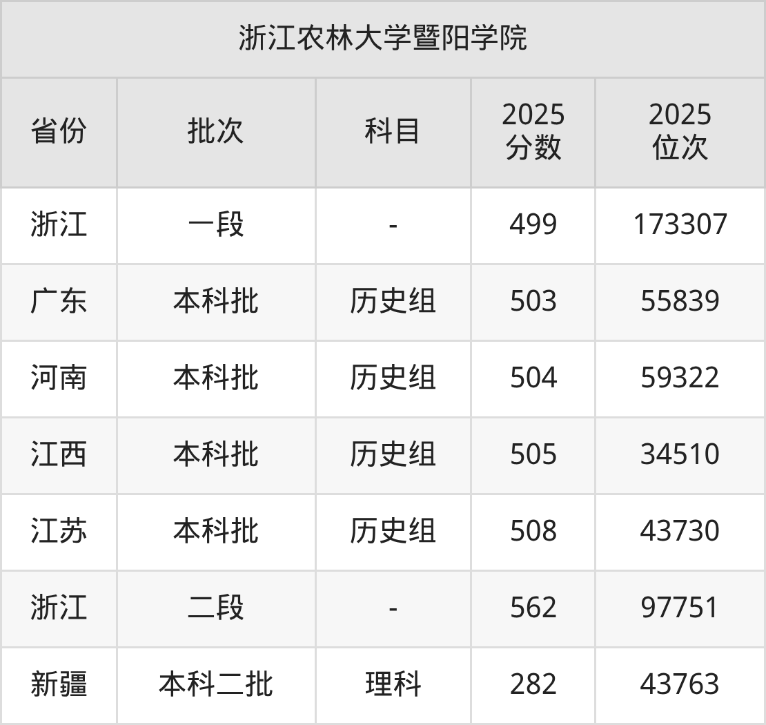 二、浙江农林大学暨阳学院2025年录取分数线汇总