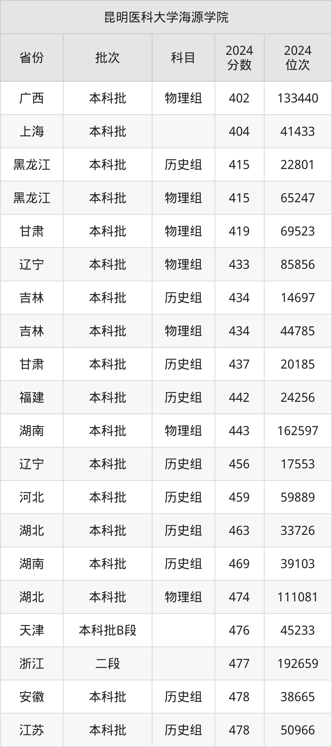 在广西本科批物理组,昆明医科大学海源学院的最低分是402、最低录取位次是133440名。在上海本科批,昆明医科大学海源学院的最低分是404、最低录取位次是41433名。