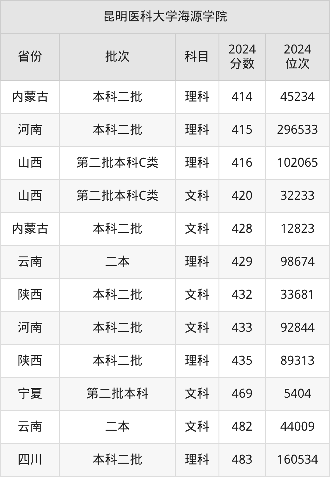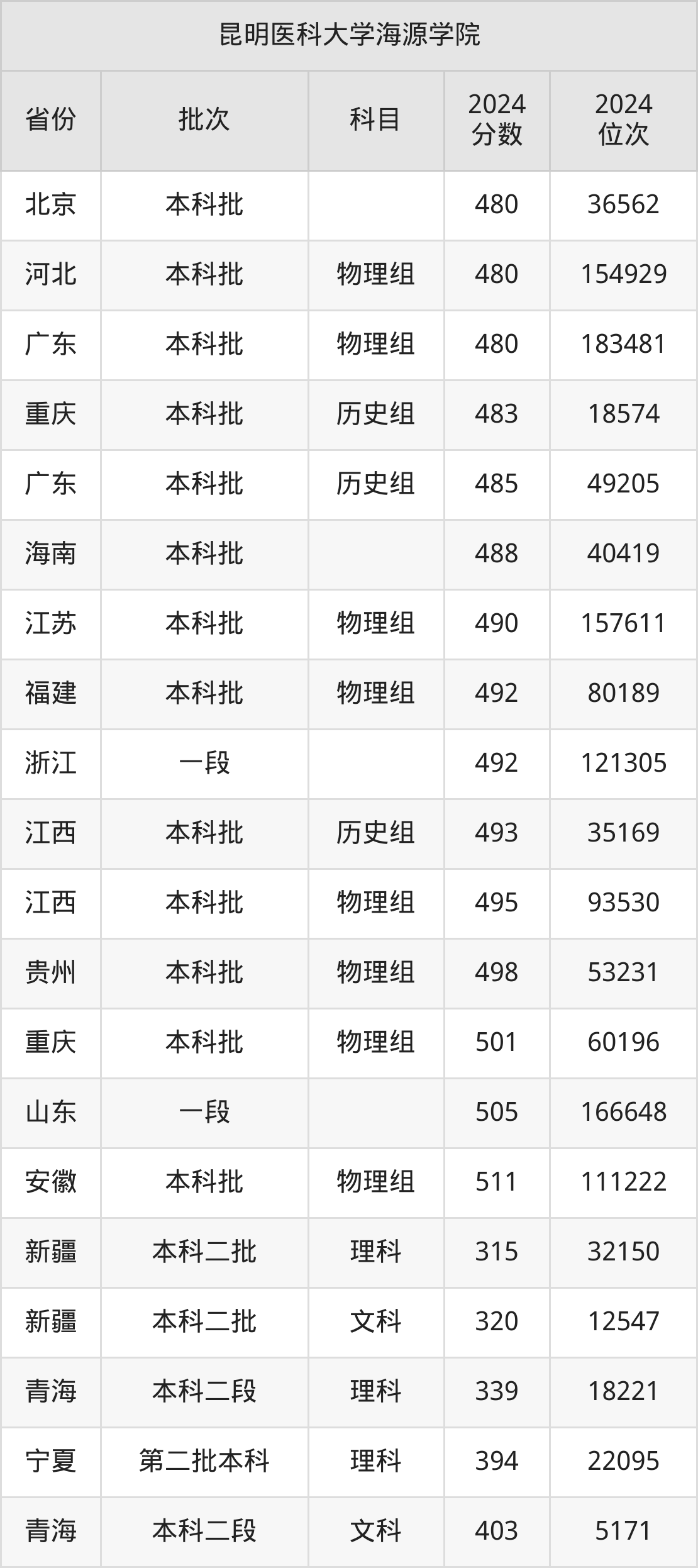 二、昆明医科大学海源学院2024年录取分数线汇总