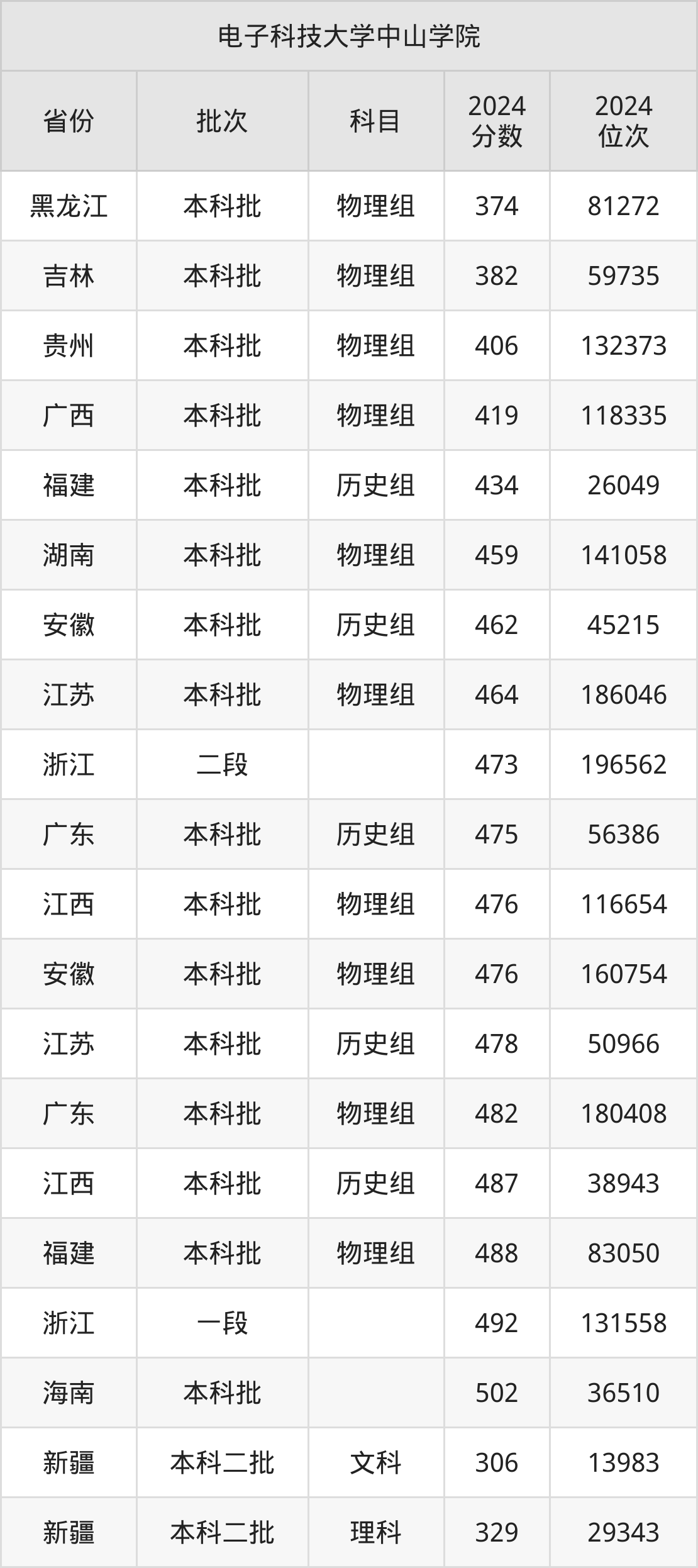 在黑龙江本科批物理组,电子科技大学中山学院的最低分是374、最低录取位次是81272名。在吉林本科批物理组,电子科技大学中山学院的最低分是382、最低录取位次是59735名。