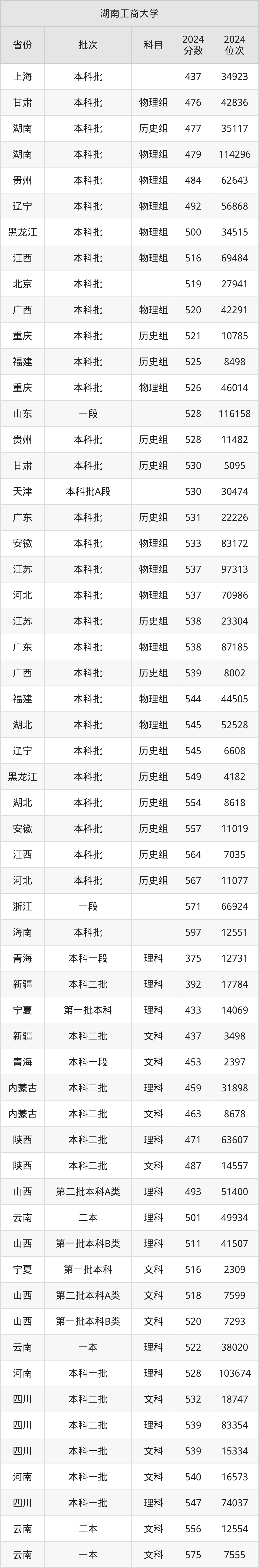 二、湖南工商大学2024年录取分数线汇总