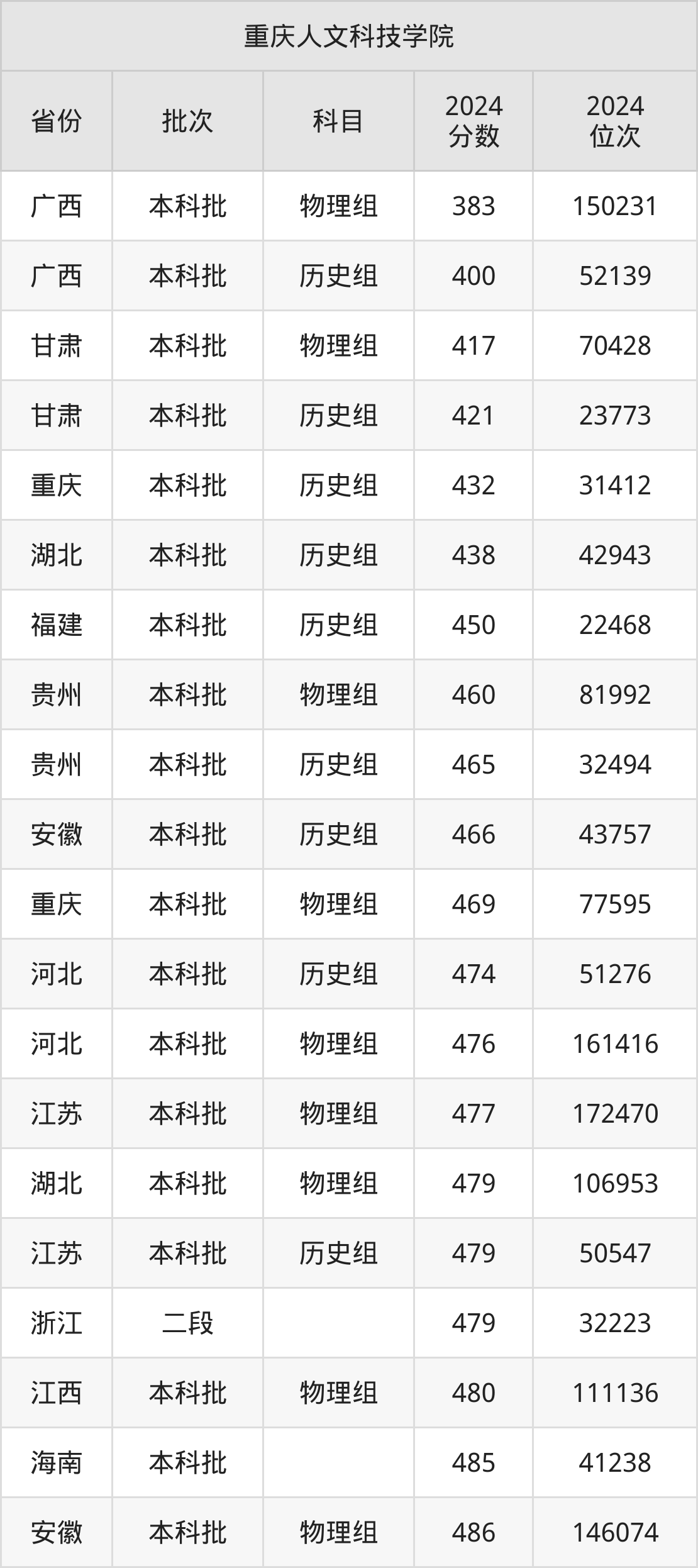 在广西本科批物理组,重庆人文科技学院的最低分是383、最低录取位次是150231名。在甘肃本科批物理组,重庆人文科技学院的最低分是417、最低录取位次是70428名。