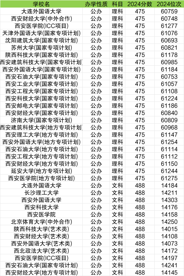 理科一本线最低的公办大学是西安医学院(地方专项计划)、延安大学(地方专项计划)、西安财经大学(国家专项计划)等,2024年最低分为475分,刚好为一本线分数,对应最低位次为61277名。