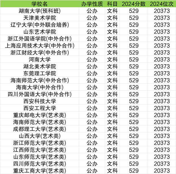 文科一本线最低的公办大学有重庆工商大学(艺术类)、四川师范大学(艺术类)、西安工程大学、西安科技大学等,2024年最低分为529分(等于一本线),对应最低位次为20373名。