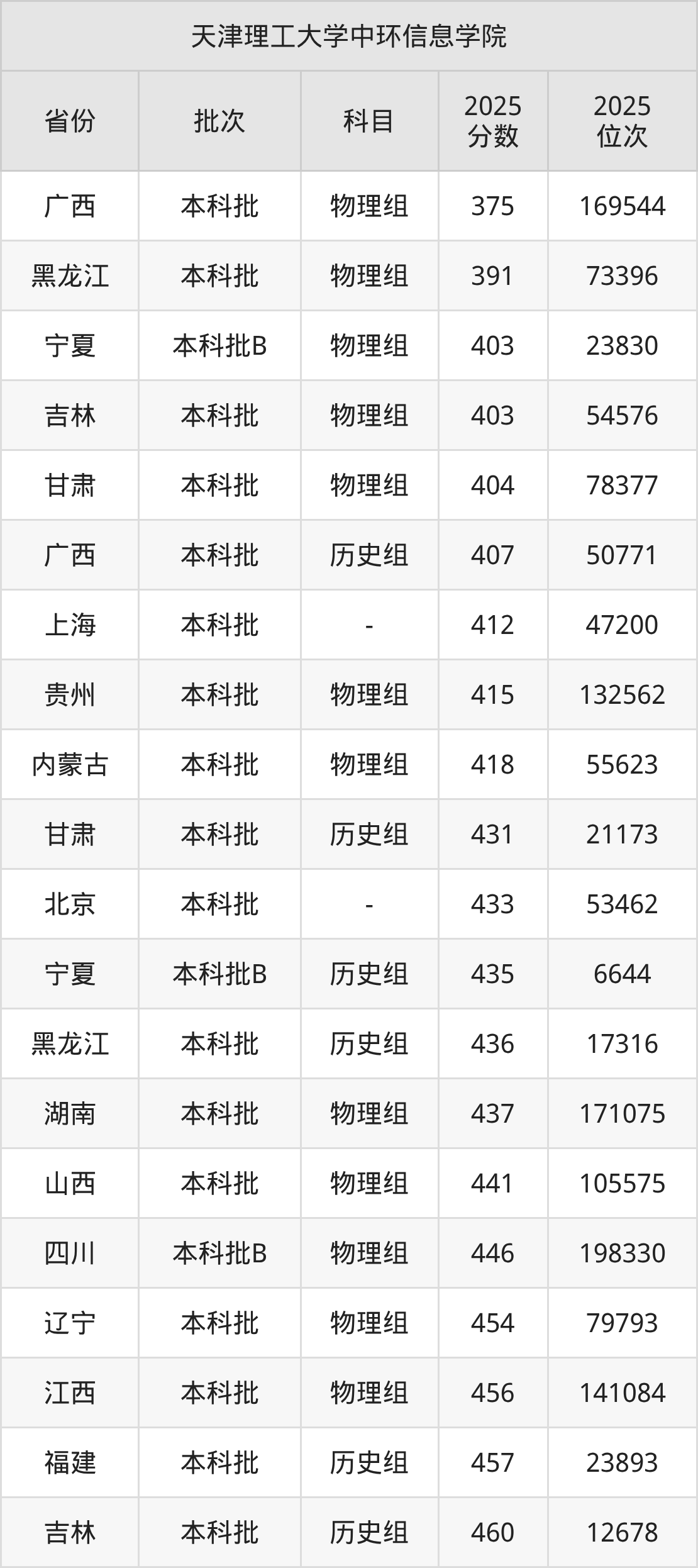 在广西本科批物理组,天津理工大学中环信息学院的最低分是375、最低录取位次是169544名。在黑龙江本科批物理组,天津理工大学中环信息学院的最低分是391、最低录取位次是73396名。