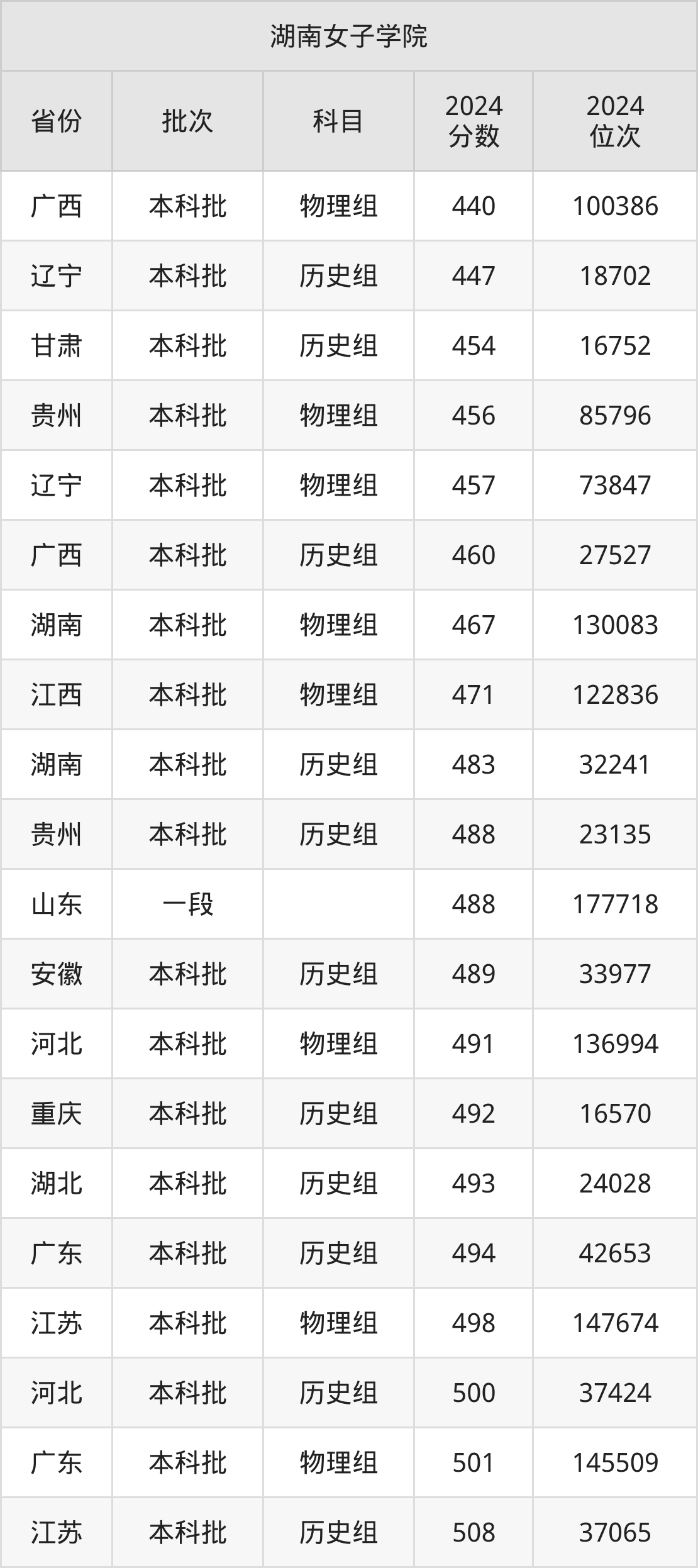 在广西本科批物理组,湖南女子学院的最低分是440、最低录取位次是100386名。在辽宁本科批历史组,湖南女子学院的最低分是447、最低录取位次是18702名。