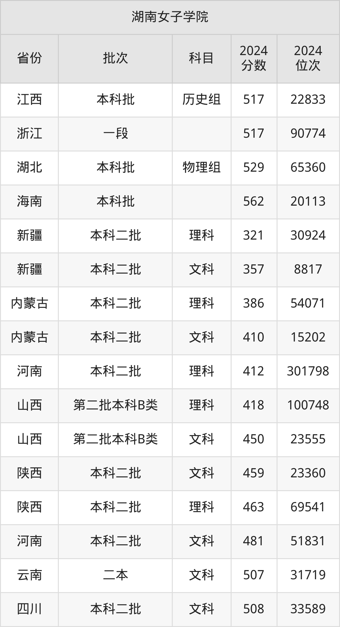 圆梦小编为2025届想要报考湖南女子学院的同学整理了:湖南女子学院2024年在全国22个省的最低分及录取位次。