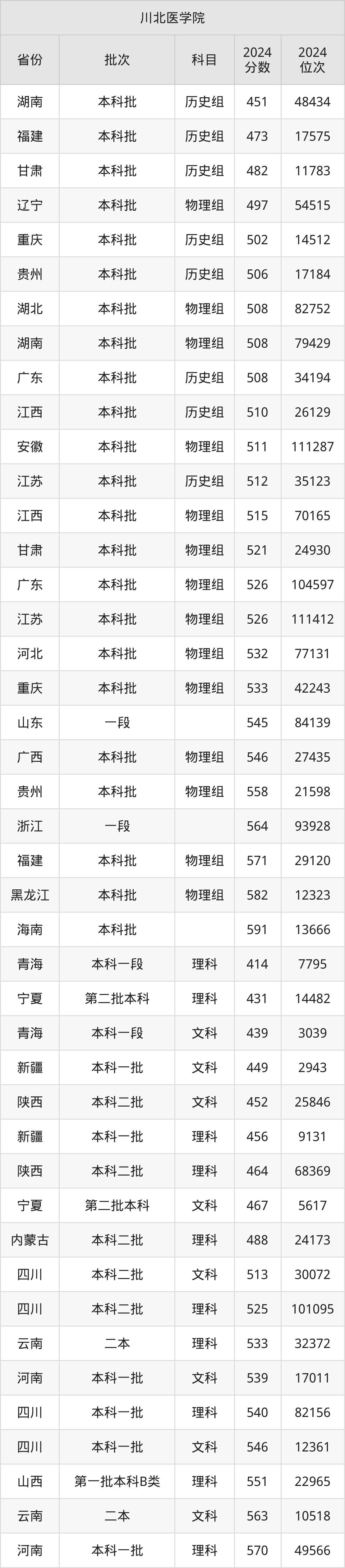 圆梦小编为2025届想要报考川北医学院的同学整理了:川北医学院2024年在全国26个省的最低分及录取位次。