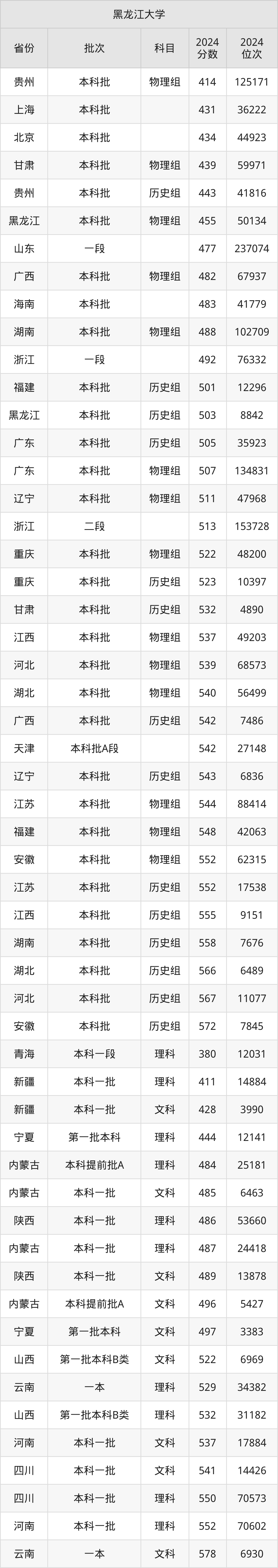 在贵州本科批物理组,黑龙江大学的最低分是414、最低录取位次是125171名。在上海本科批,黑龙江大学的最低分是431、最低录取位次是36222名。