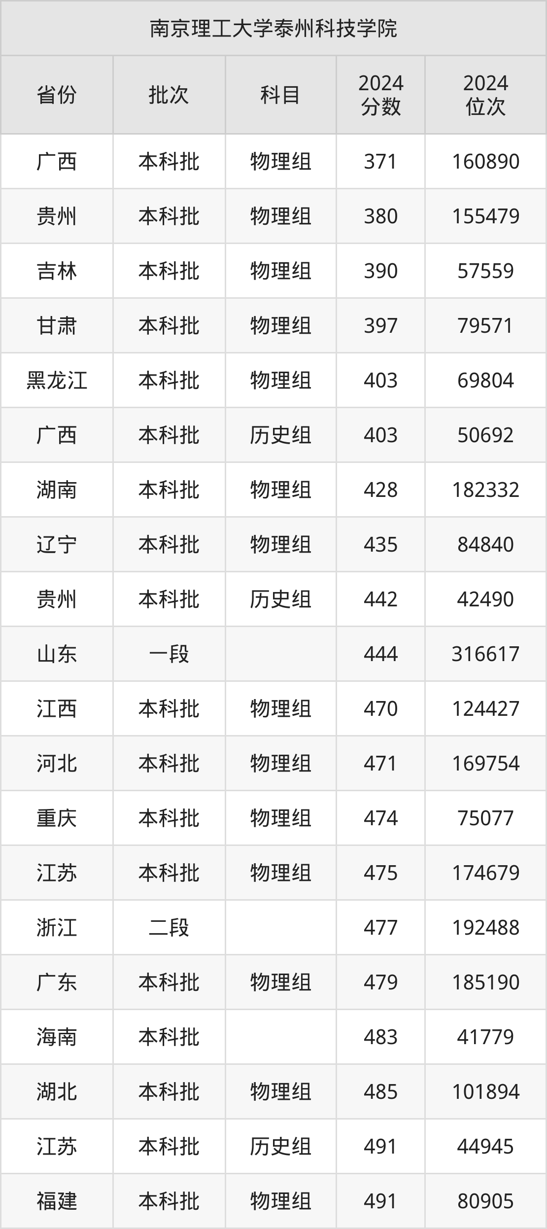 在广西本科批物理组,南京理工大学泰州科技学院的最低分是371、最低录取位次是160890名。在贵州本科批物理组,南京理工大学泰州科技学院的最低分是380、最低录取位次是155479名。