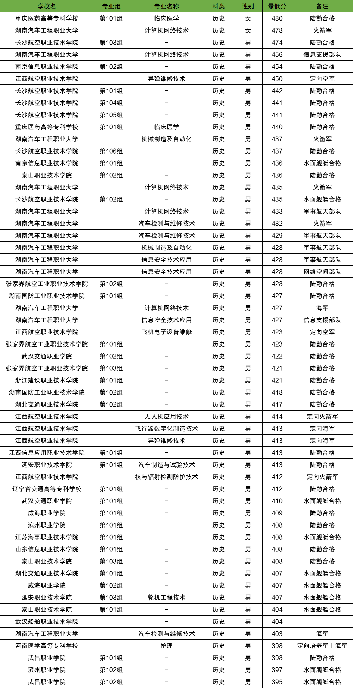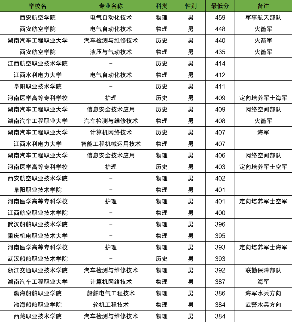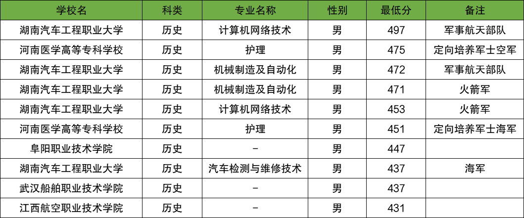 陕西省定向培养军士部分院校最低录取分数线如下: