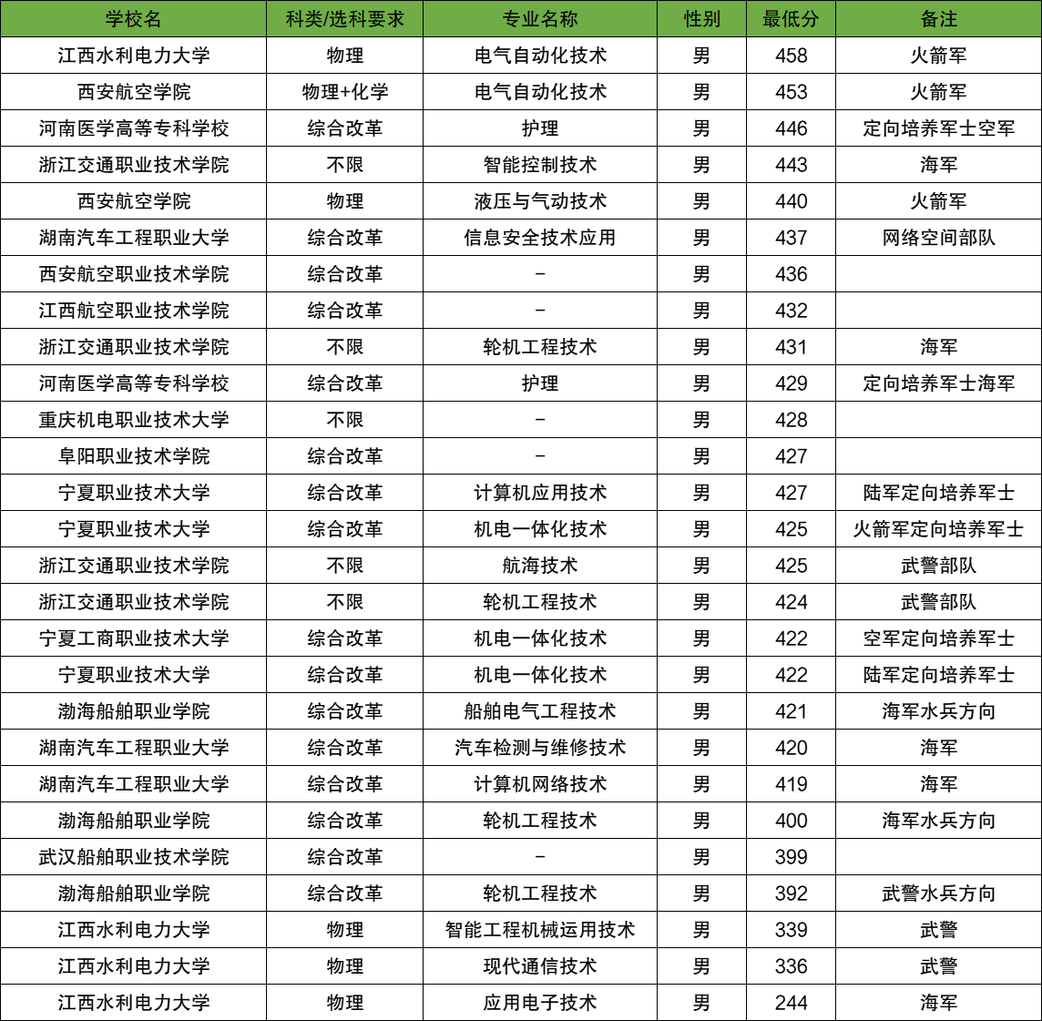 山东报考全国定向士官学校,分数线最高的是江西水利电力大学(电气自动化技术),分数为458分;其次是西安航空学院(电气自动化技术),453分。