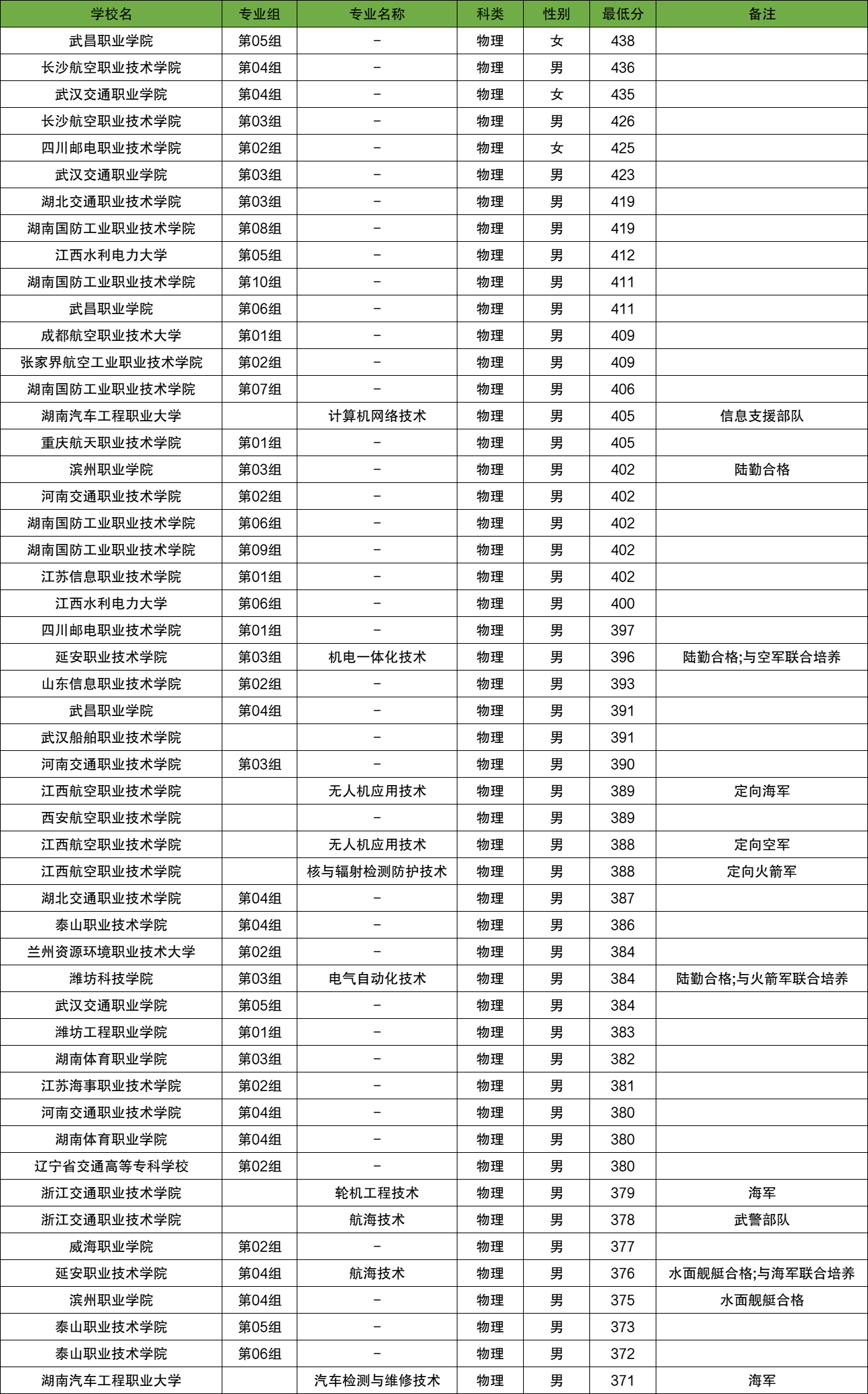 在江西物理类中,投档分数线最低的是武昌职业学院第J32组391分,要求男生、水面舰艇合格。