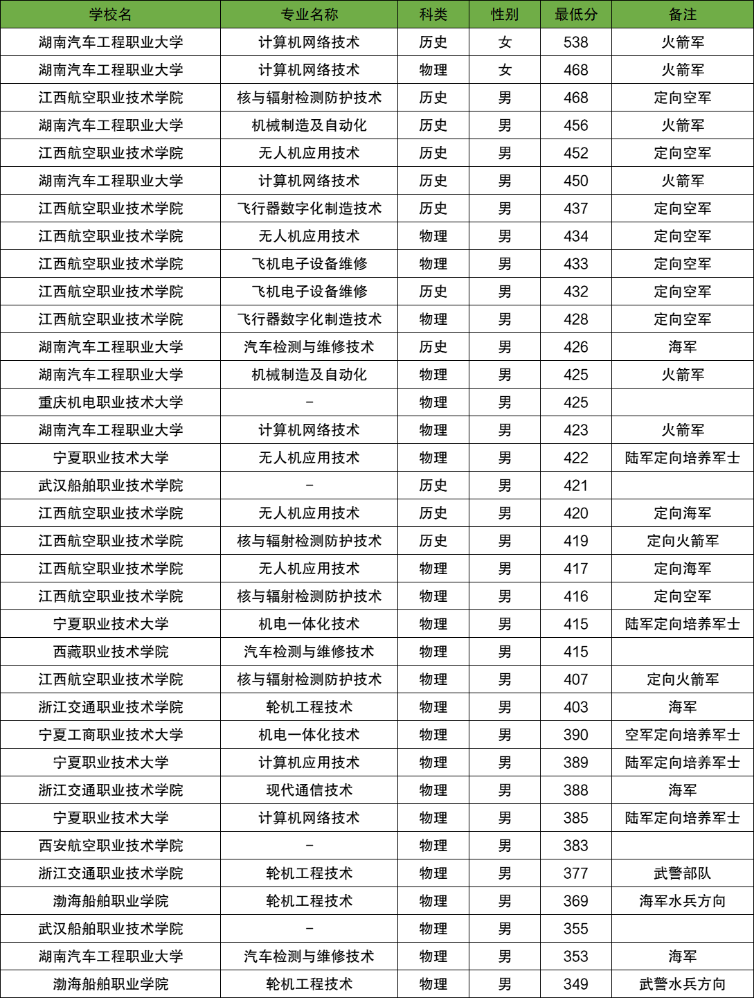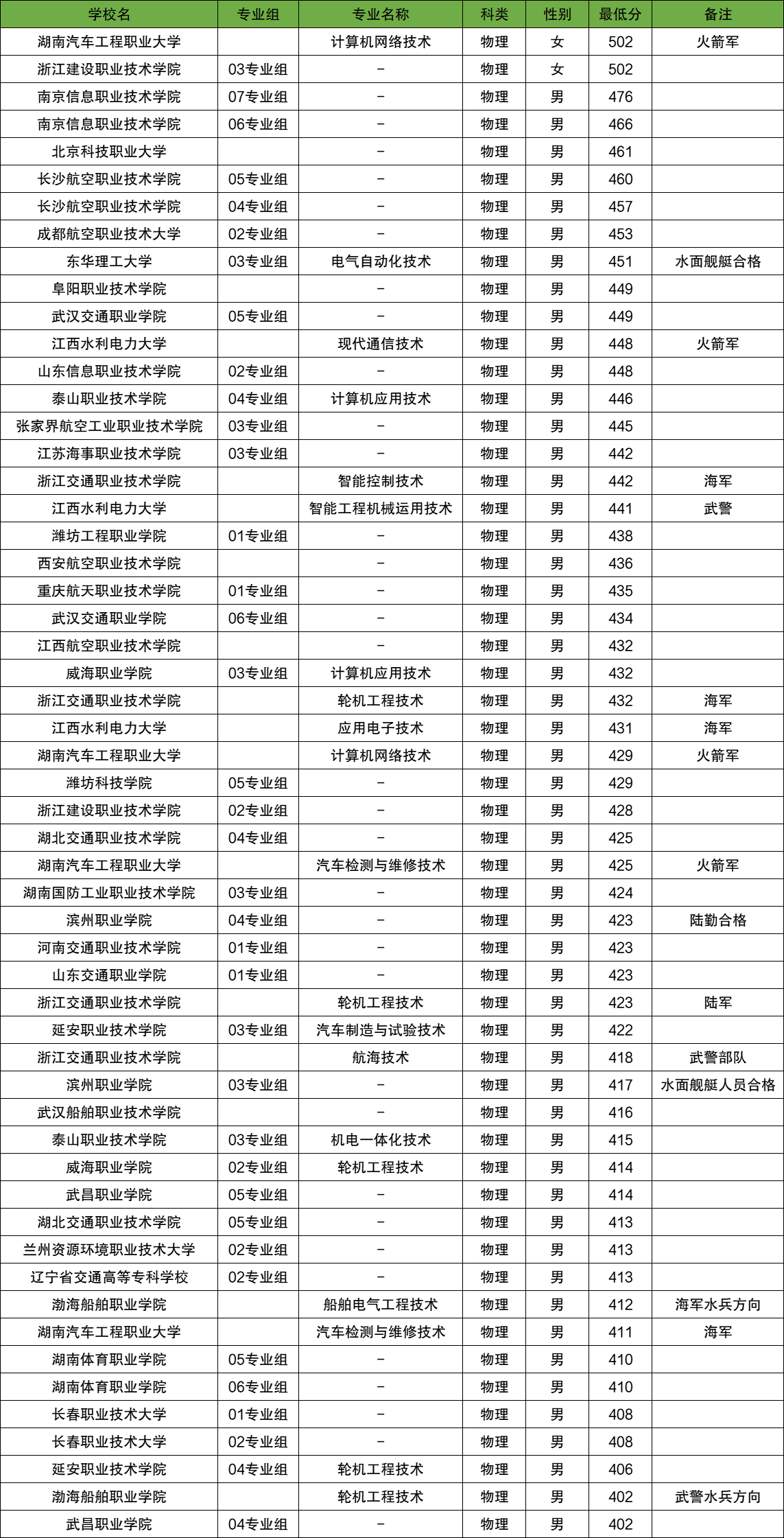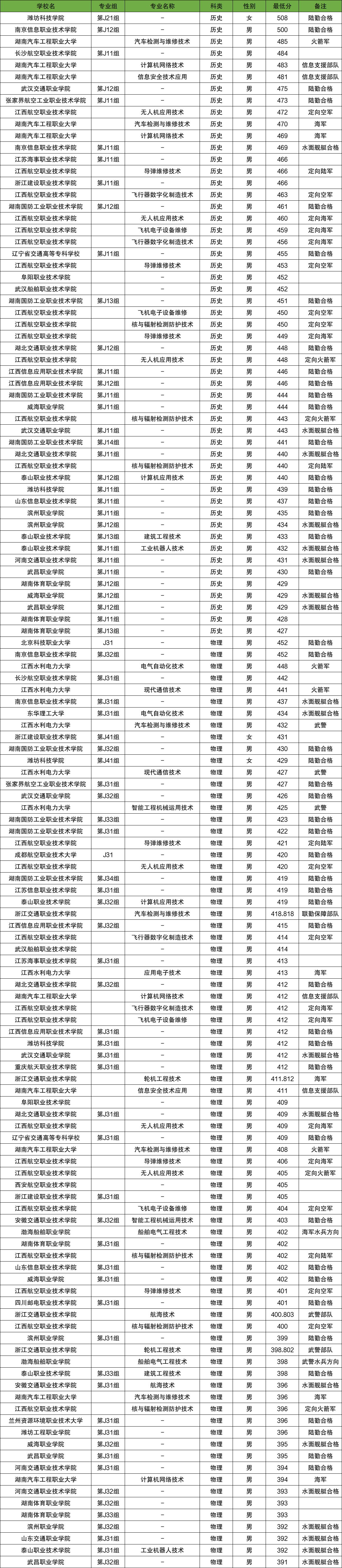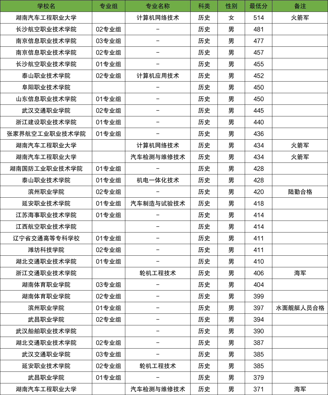 分数线较高的有湖南汽车工程职业大学(计算机网络技术)514分、长沙航空职业技术学院02专业组)481分、南京信息职业技术学院(03专业组)477分。