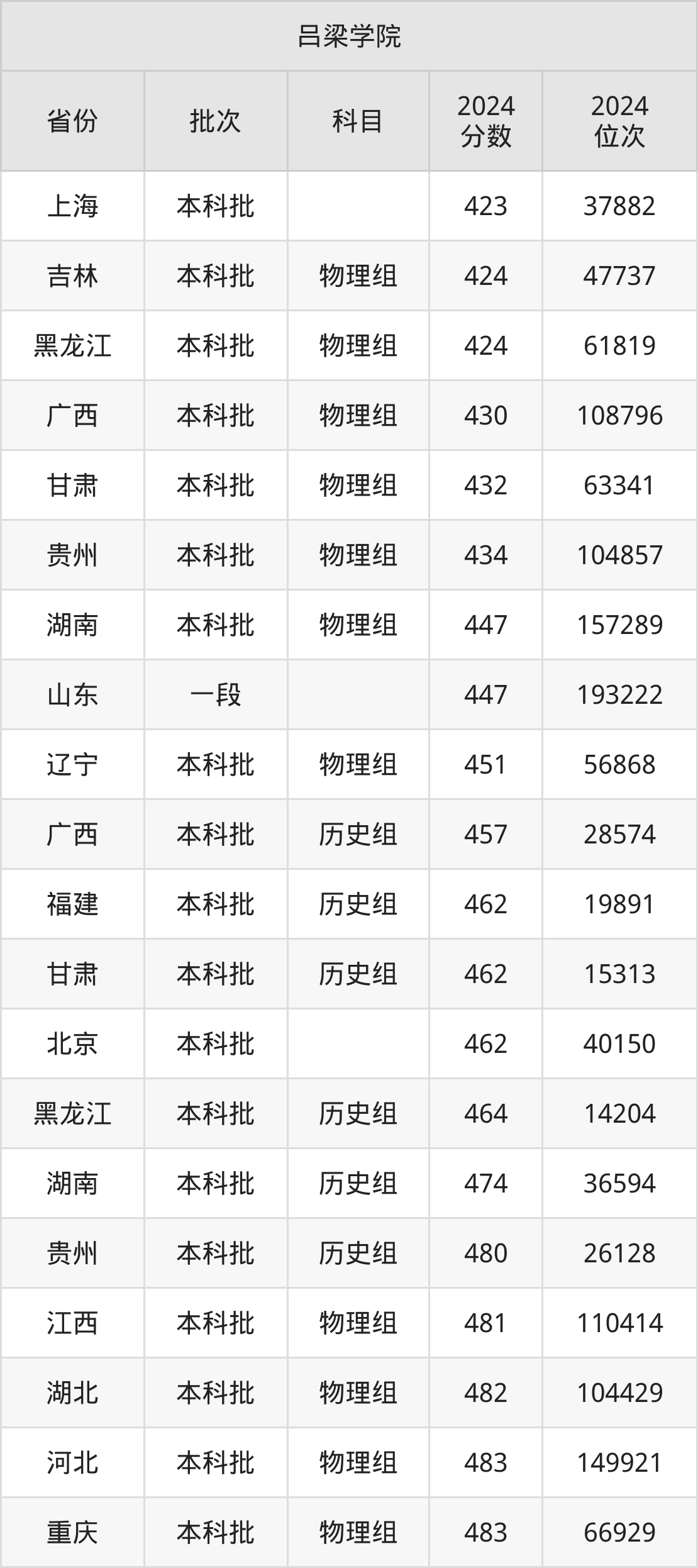 在上海本科批,吕梁学院的最低分是423、最低录取位次是37882名。在吉林本科批物理组,吕梁学院的最低分是424、最低录取位次是47737名。