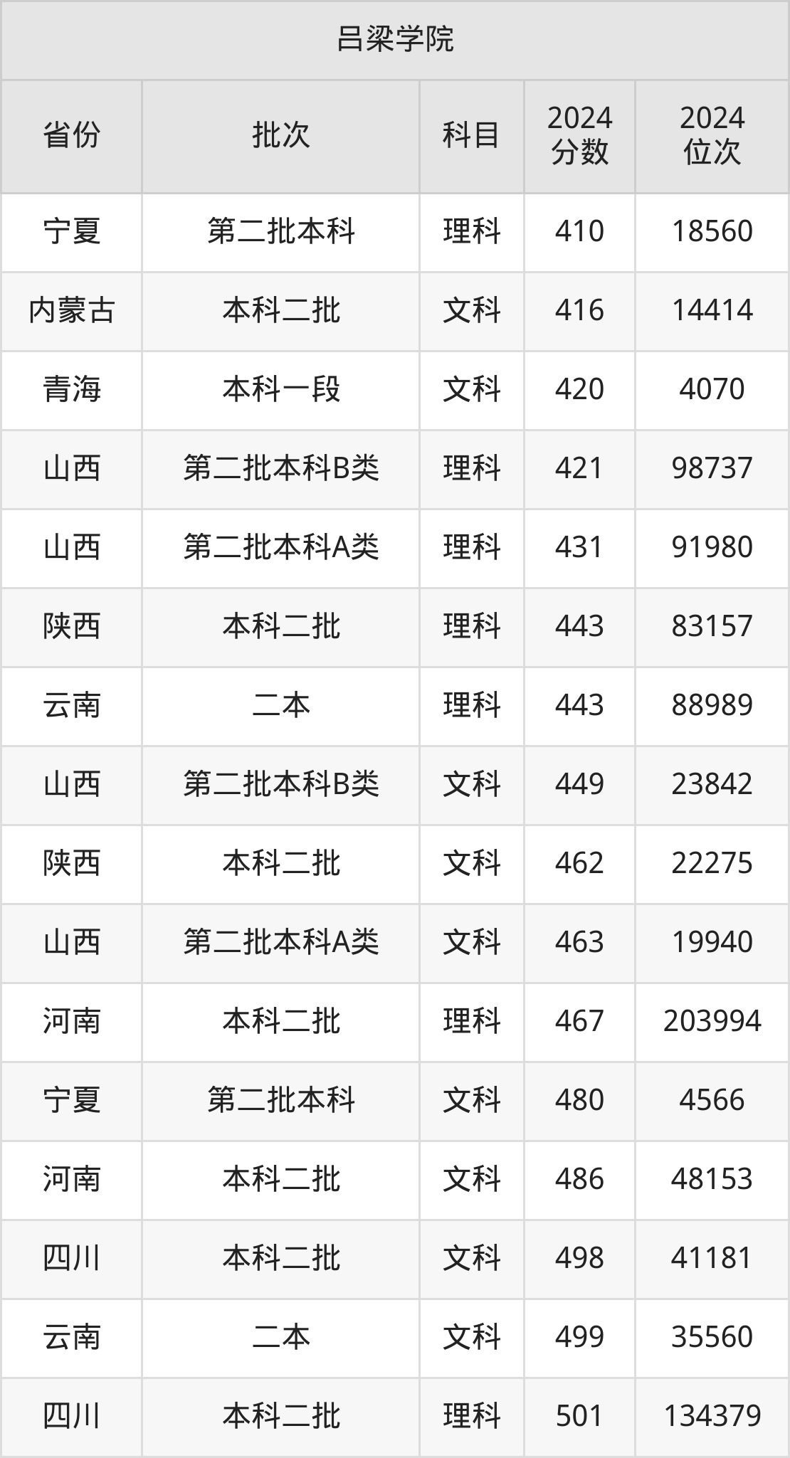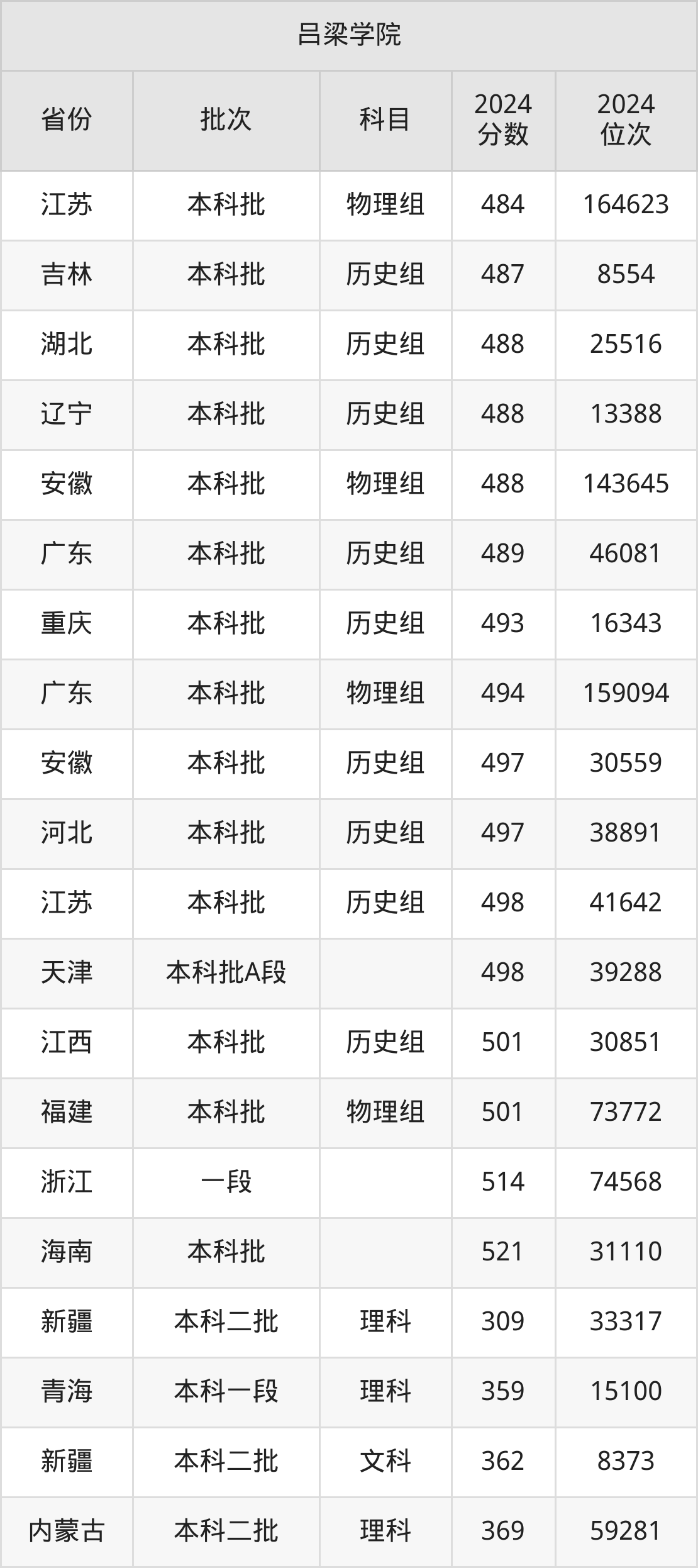 圆梦小编为2025届想要报考吕梁学院的同学整理了:吕梁学院2024年在全国30个省的最低分及录取位次。