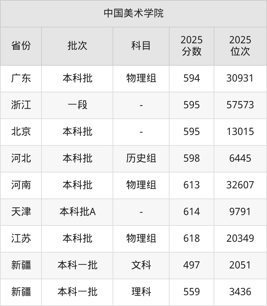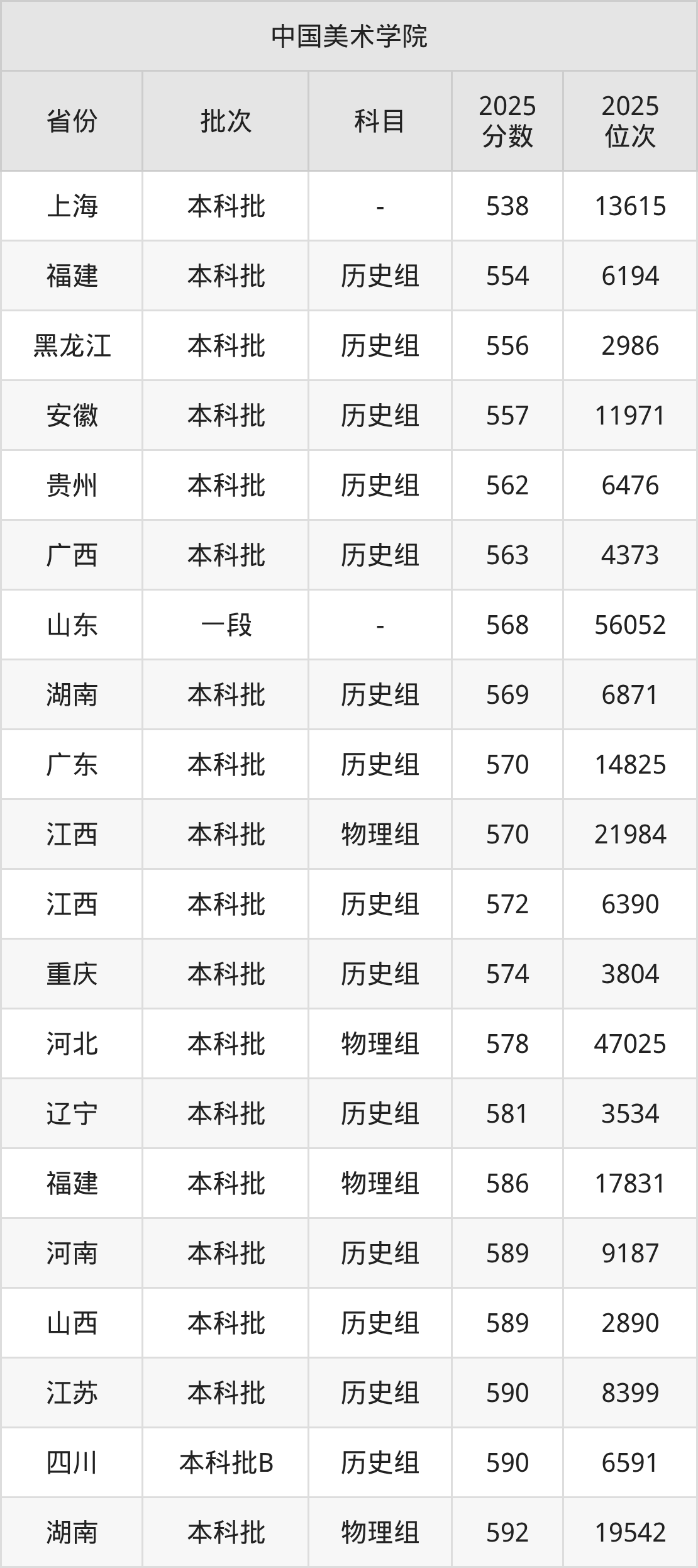 圆梦小编为2026届想要报考中国美术学院的同学整理了:中国美术学院2025年在全国21个省的最低分及录取位次。
