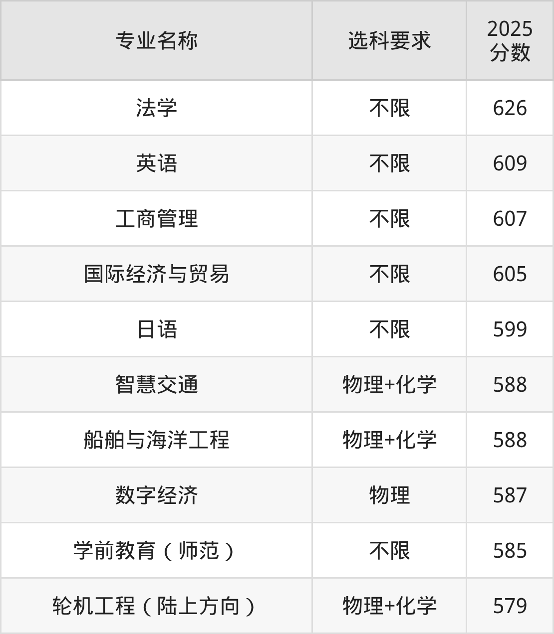 对于浙江高三学生而言,集美大学热门专业是:法学、英语、工商管理、国际经济与贸易、日语、智慧交通、船舶与海洋工程、数字经济、学前教育、轮机工程,2025年在浙江的最低分是579至626。