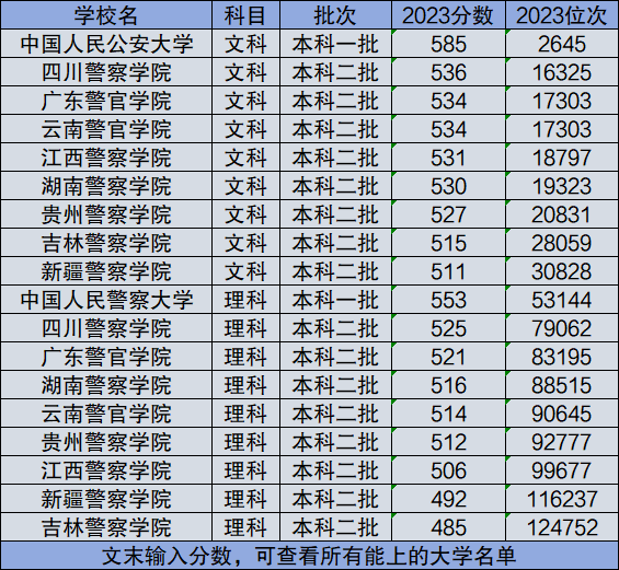 目前实力突出的警察大学主要集中在公安大学和警大两所,在各省份招生录取中,这两所学校的收分都是最高的,同时也是最难考取的。除此之外像四川警察学院、云南警官学院、江西警察学院这几所大学,也同样值得同学们参考。
