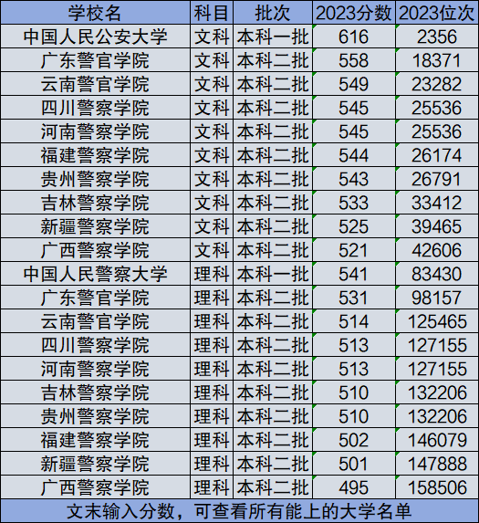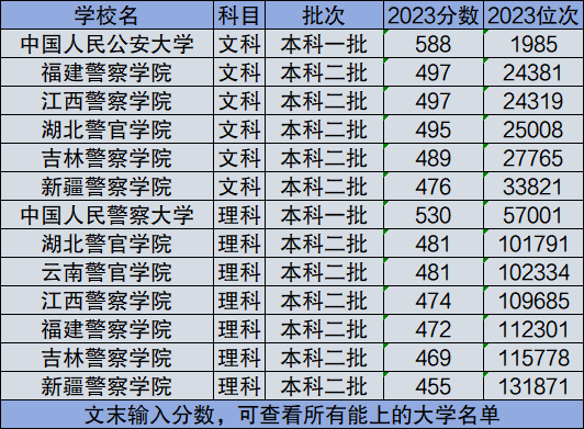 根据圆梦志愿所整理的数据可知,2023年警察大学在安徽省文科收分最高的大学主要是中国人民公安大学,这所学校在安徽省最低分588分,在本科一批录取,超过一本批次线93分;理科收分最高的大学为中国人民警察大学,也是在一本录取,超过了一本批次线48分。