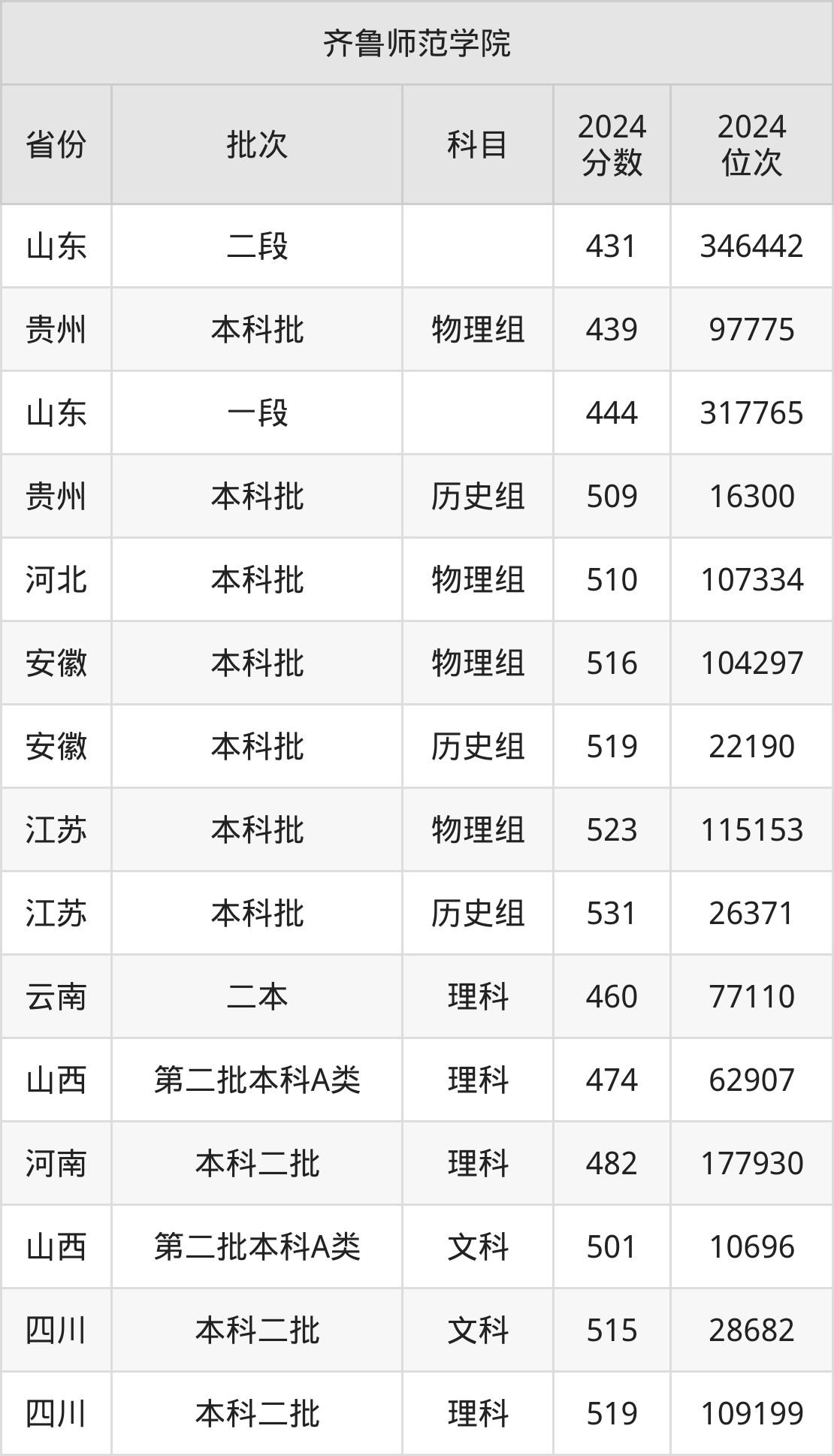 在山东二段,齐鲁师范学院的最低分是431、最低录取位次是346442名。在贵州本科批物理组,齐鲁师范学院的最低分是439、最低录取位次是97775名。