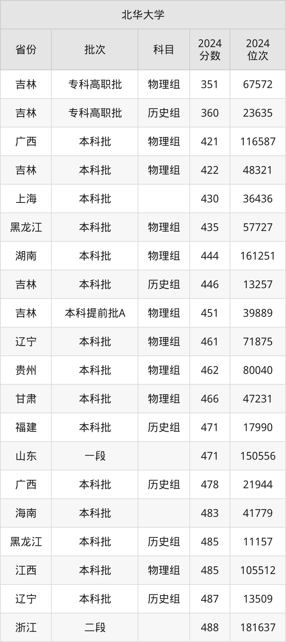 在吉林专科高职批物理组,北华大学的最低分是351、最低录取位次是67572名。在广西本科批物理组,北华大学的最低分是421、最低录取位次是116587名。